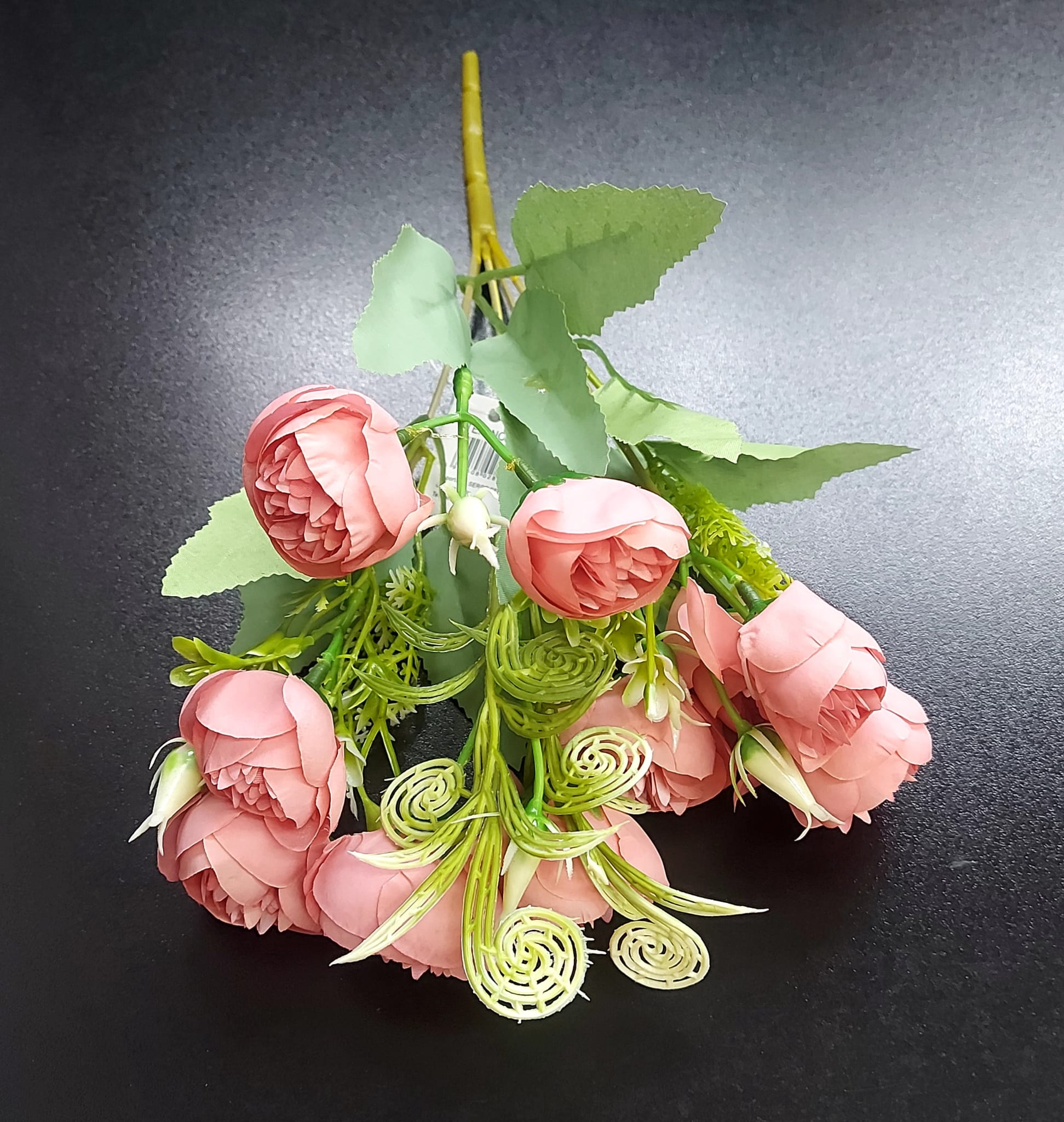 Adaugă un strop de culoare și rafinament cu acest buchet de flori artificiale ranunculus în nuanță roz coral. Realizat cu atenție la detalii, buchetul are un aspect natural, completat de frunze verzi și accente florale decorative, ideal pentru decoruri elegante acasă, evenimente speciale sau vitrine comerciale.