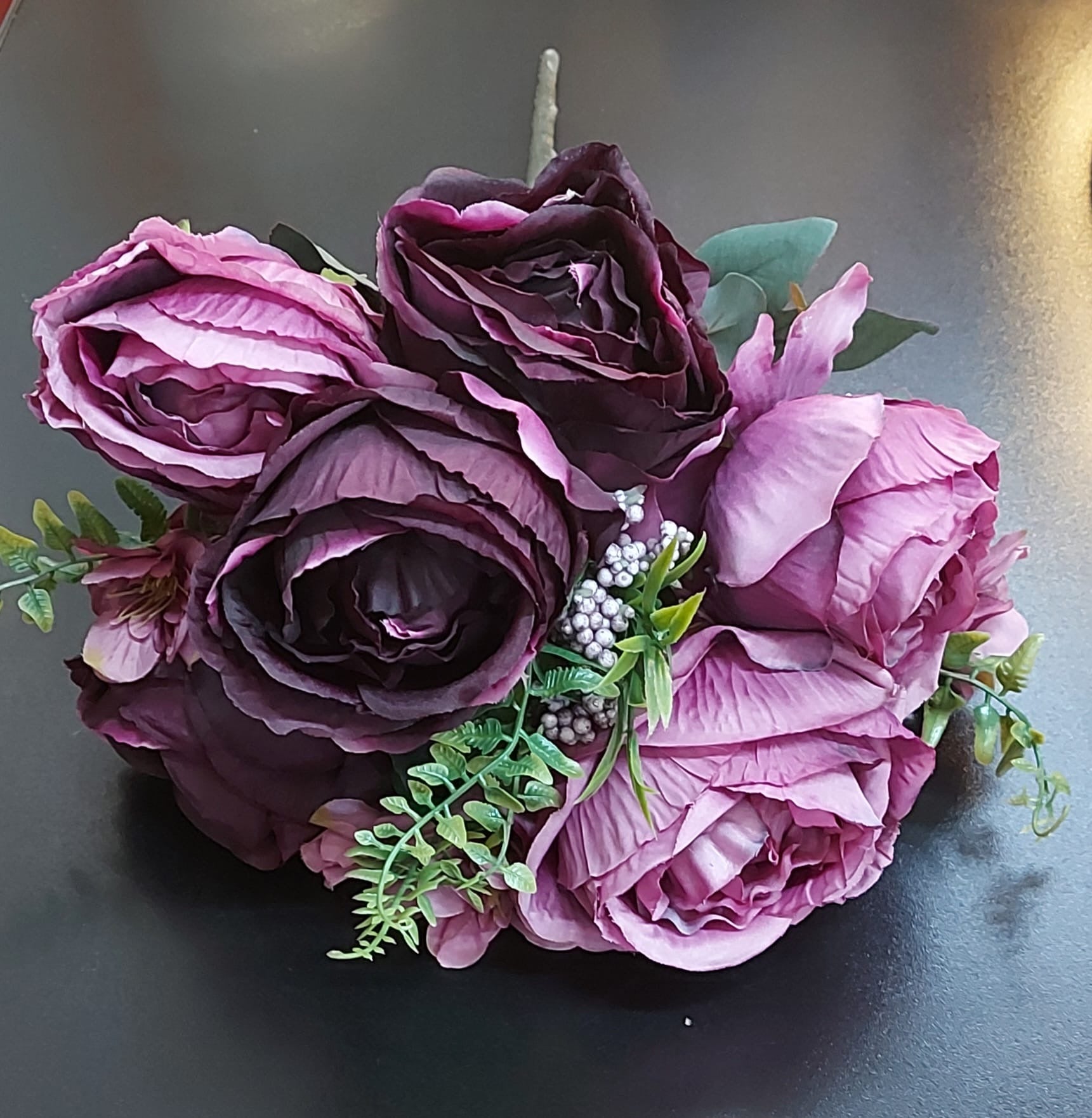 Buchet artificial cu trandafiri în nuanțe elegante de mov închis, prune și lila prăfuit, cu frunziș verde și accente decorative (ferigă și bobițe argintii). Este un buchet cu aspect misterios și sofisticat, perfect pentru decoruri vintage, elegante sau de toamnă.