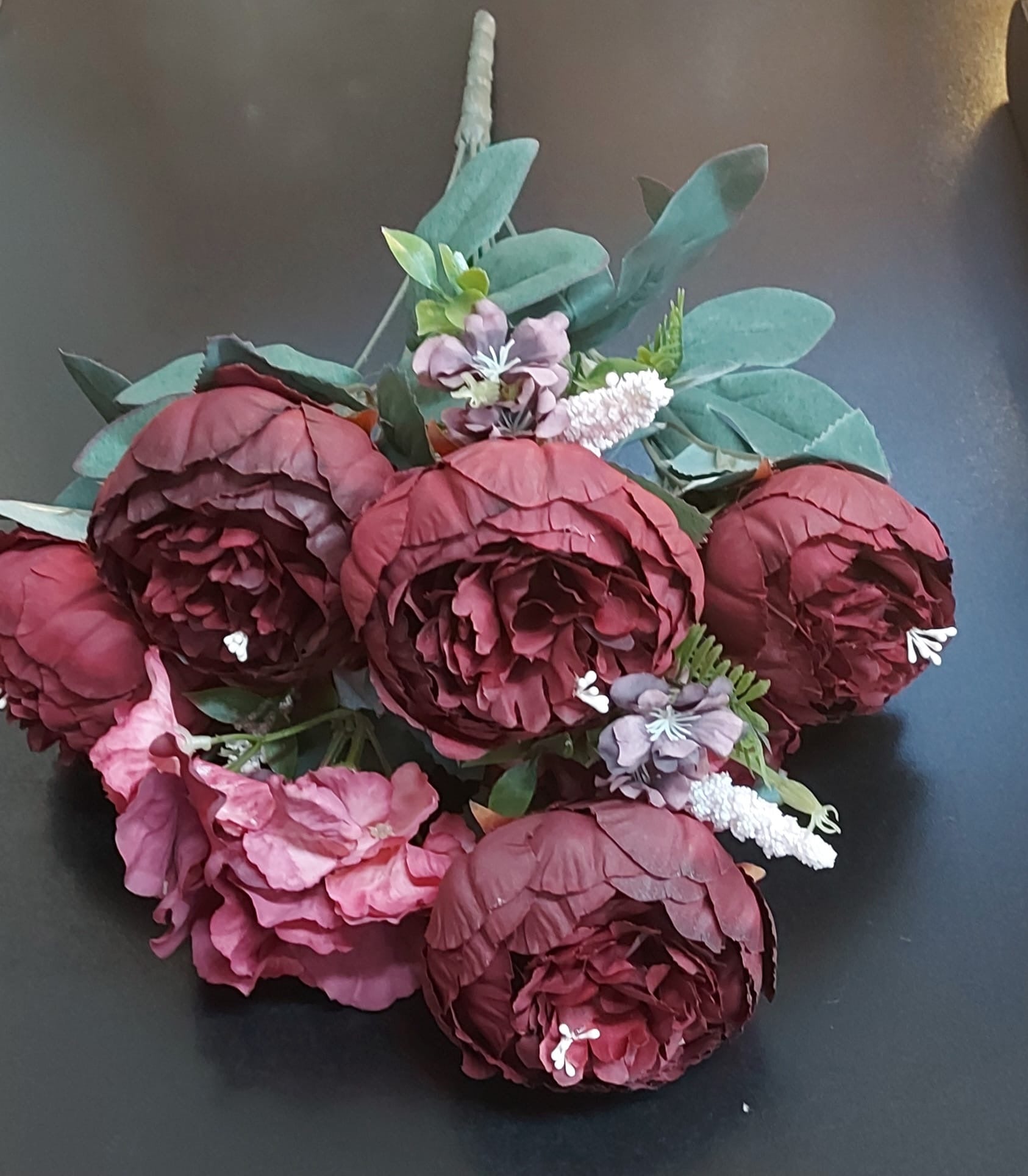 Buchet artificial cu bujori în nuanță intensă de burgundy (vișiniu închis), completat cu flori secundare roz și mov prăfuit, plus frunze verzi-măslinii (stil eucalipt artificial). Este un buchet cu aspect elegant, misterios și sofisticat – perfect pentru decoruri vintage, toamnă sau evenimente de