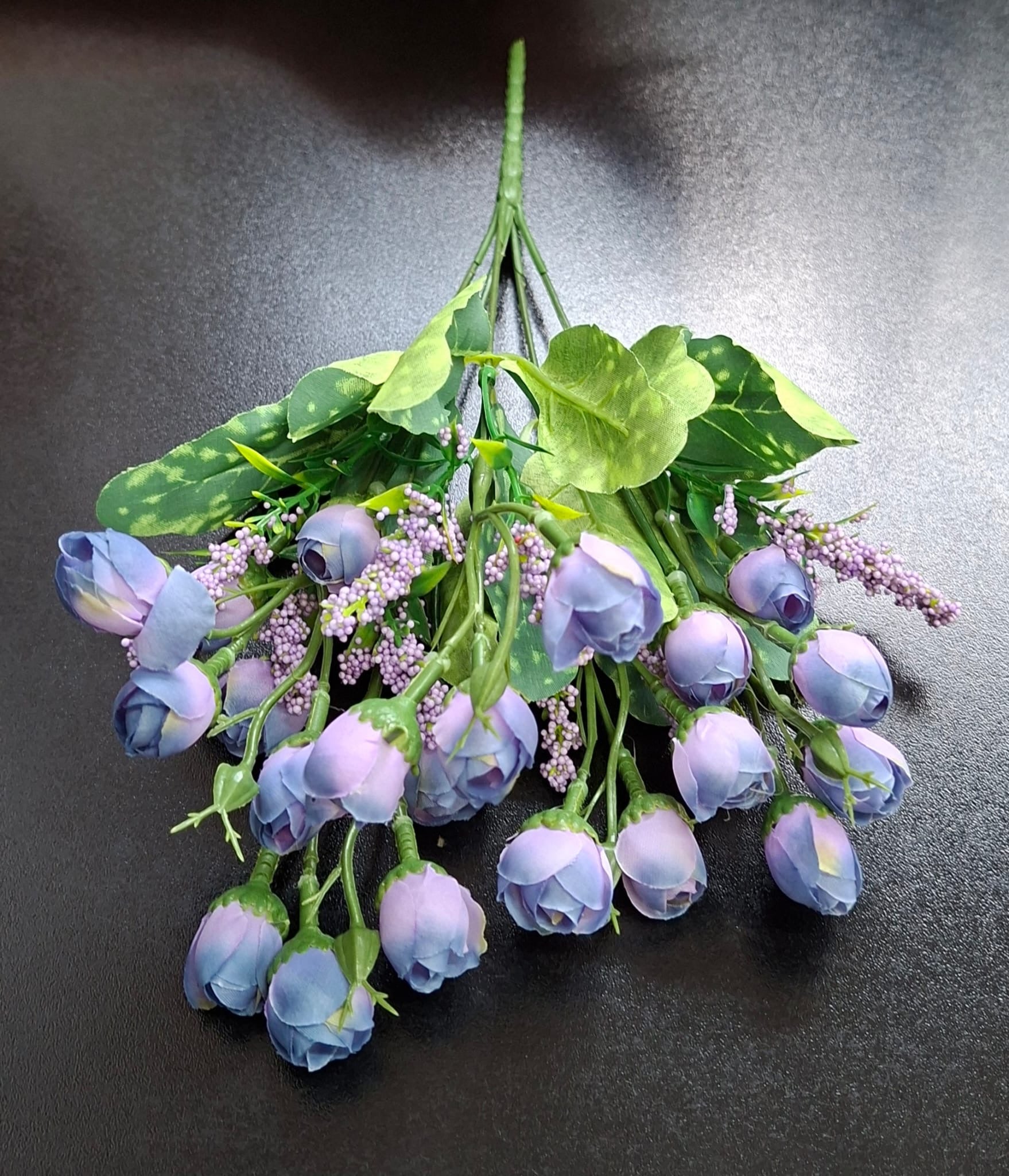 Buchet artificial cu trandafiri mici în nuanțe de mov lavandă cu accente albastre, ideal pentru decor elegant sau evenimente speciale. Realizat cu flori realiste și accente de gypsophila, buchetul de 30 cm adaugă un plus de rafinament în orice aranjament. Perfect pentru mese festive, cadouri sau decor interior.