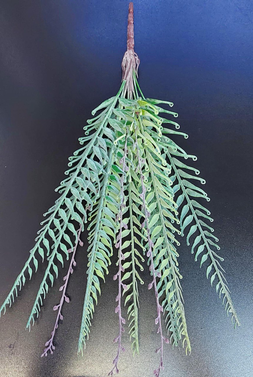Ramură artificială decorativă cu design elegant, inspirat de frunzele de ferigă, având un aspect ușor curgător. Combină tonuri de verde pastel cu accente mov, fiind ideală pentru aranjamente creative, decoruri naturale sau amenajări interioare moderne.