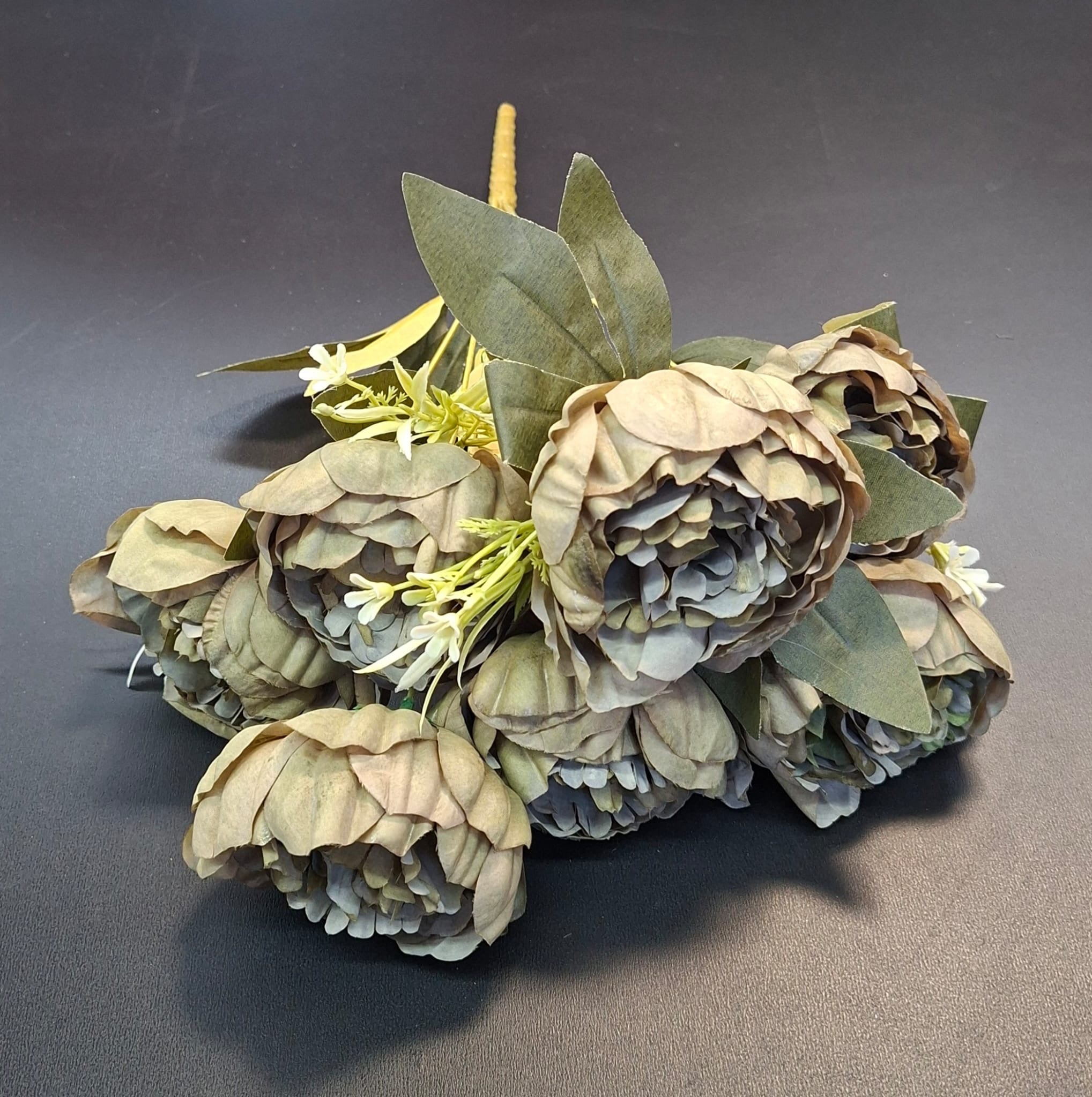 Un buchet cu personalitate, ideal pentru decoruri în tonuri naturale și neutre. Bujorii artificiali în nuanțe de kaki-gri și frunzele cu aspect realist oferă un aer modern, sobru și sofisticat, perfect pentru interioare rafinate, vitrine sau evenimente elegante. Un aranjament de impact, ce nu necesită întreținere și păstrează eleganța zi după zi.