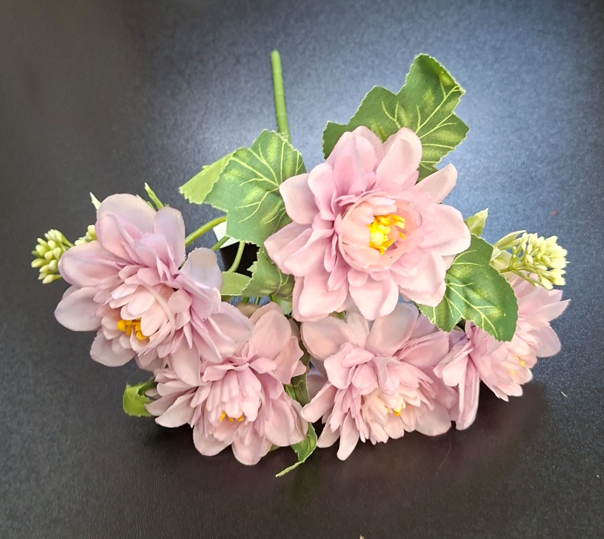 Adaugă un aer delicat și proaspăt cu acest buchet de dalii artificiale în nuanță lila deschis. Florile bogate, cu petale multiple și centru galben vibrant, sunt însoțite de frunze verzi cu detalii realiste. Perfect pentru decoruri romantice, aranjamente de nuntă, vitrine sau cadouri florale.