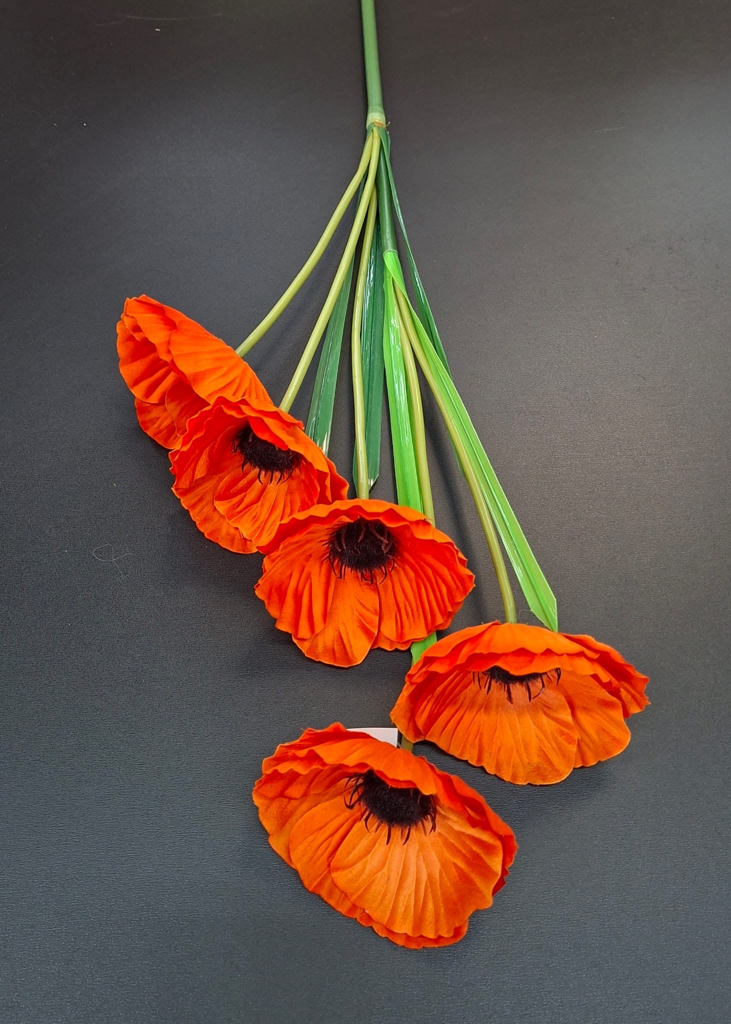 Completează-ți decorul cu această floare de mac artificial portocaliu, elegantă și realistă! Tulpina verde, flexibilă, susține 5 flori bogate, cu petale catifelate portocalii și centru negru, perfect conturat. Este alegerea ideală pentru decoruri naturale, vitrine, evenimente sau aranjamente florale de impact.