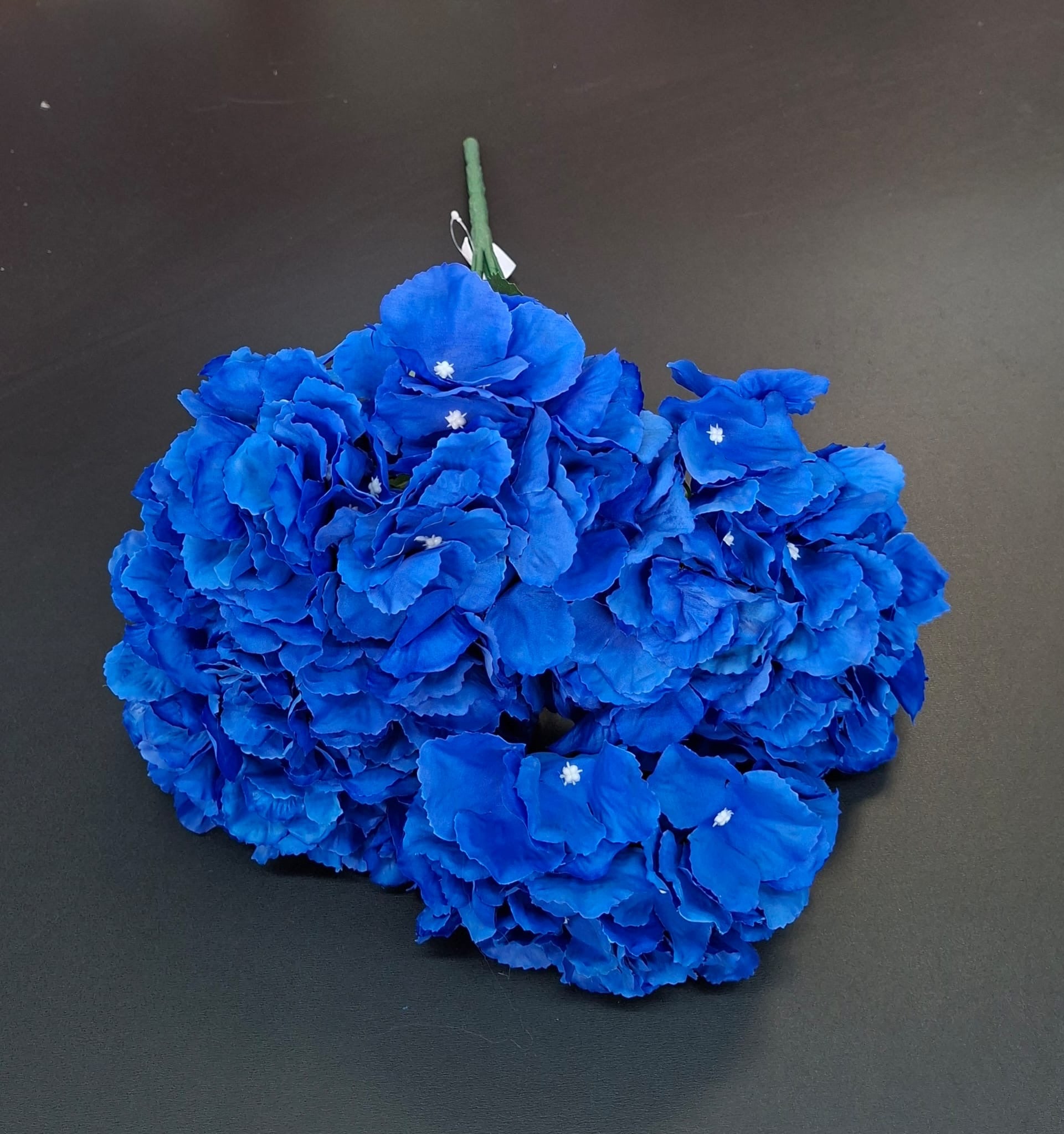 Buchet de hortensie artificială într-o nuanță vibrantă de albastru regal, cu flori mari și petale bogate, ce redau fidel aspectul florilor naturale. Această culoare impunătoare este ideală pentru decoruri tematice, aranjamente florale creative, evenimente elegante sau spații comerciale moderne.