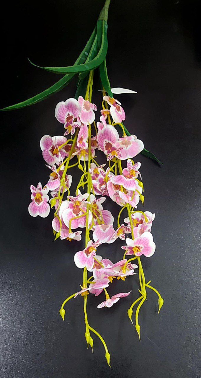 Ramură decorativă cu flori artificiale de orhidee, realizată cu atenție la detalii pentru un aspect natural și elegant. Ideală pentru aranjamente florale spectaculoase, decorarea evenimentelor sau completarea unui colț special din locuință. Designul curgător și frunzele verzi conferă un plus de rafinament și versatilitate în orice decor interior.