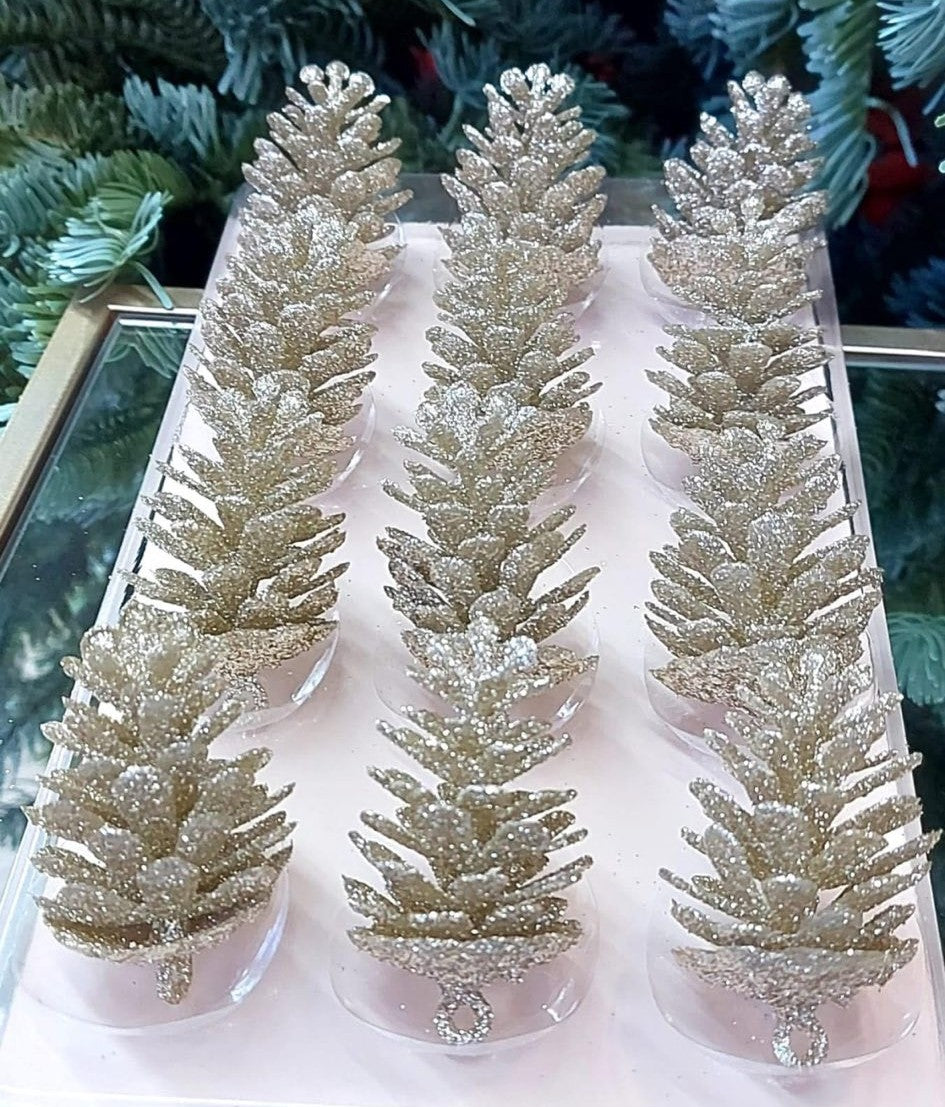 Adaugă o notă elegantă și festivă bradului de Crăciun cu acest set de 12 conuri aurii strălucitoare, perfecte pentru decorarea pomului, coronițelor sau aranjamentelor de iarnă. Fiecare con are 6 cm și este acoperit cu un strat fin de sclipici auriu care reflectă frumos lumina.