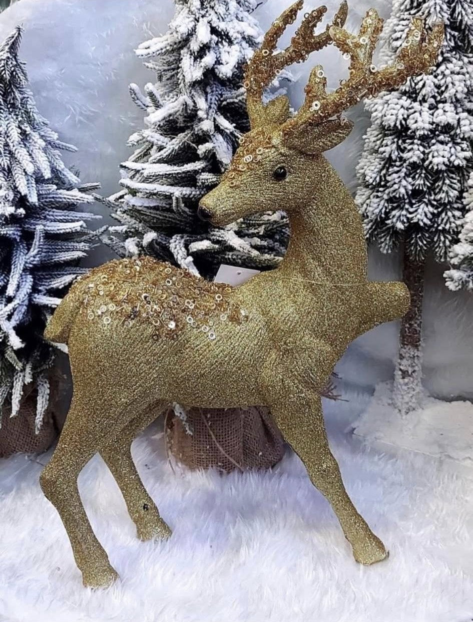 Adaugă un plus de strălucire decorului tău de Crăciun cu acest ren decorativ auriu, decorat manual cu sclipici și paiete. Cu un design elegant și dimensiuni de 45x50 cm, este alegerea perfectă pentru un decor festiv sofisticat, ideal pentru interior sau vitrine de sărbători.