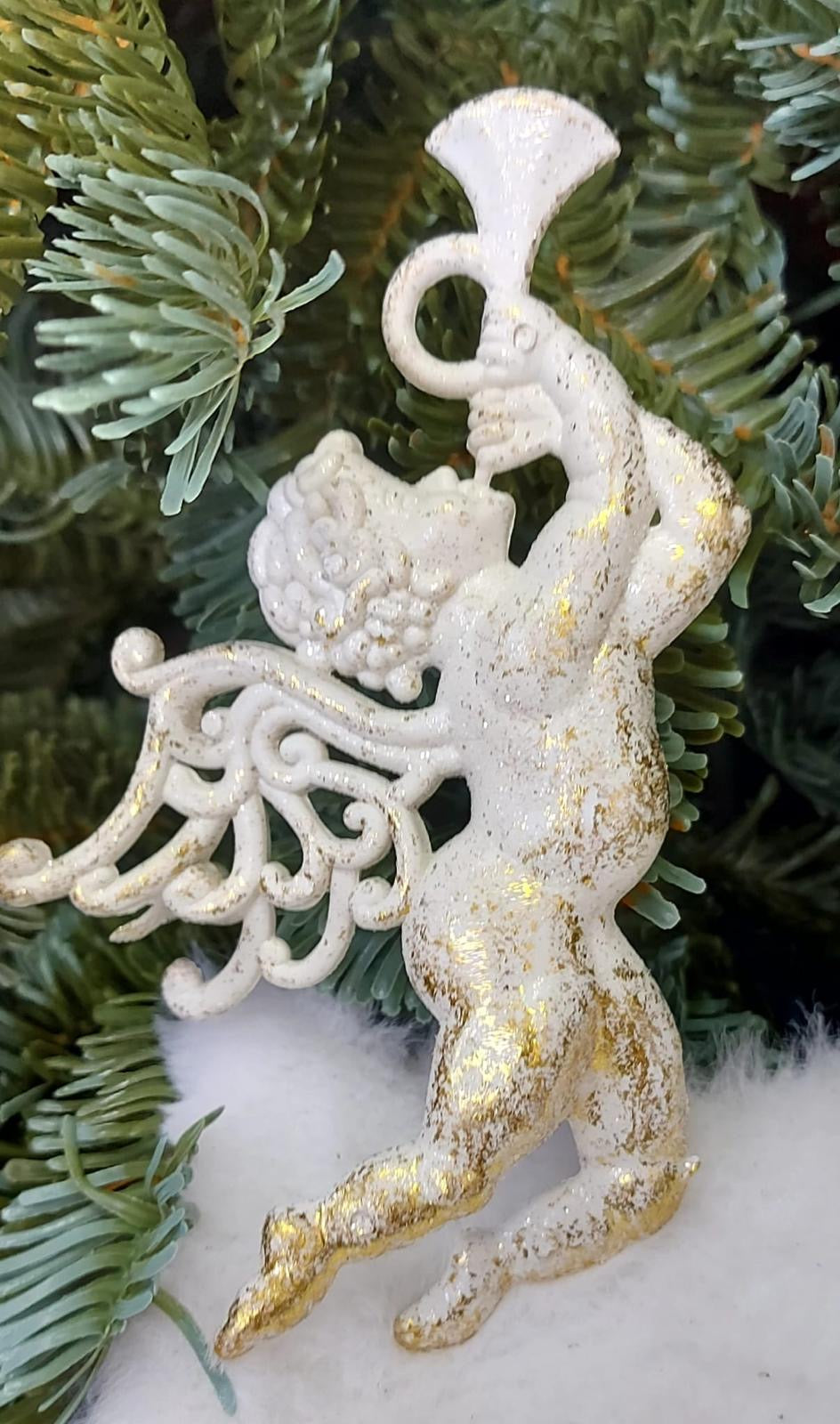 Adaugă o notă divină decorului tău de Crăciun cu acești îngerași decorativi albi cu sclipici auriu. Realizați din material ușor și acoperiți cu glitter fin, oferă un efect cald și elegant în lumina bradului. Perfecți pentru brad, coronițe, aranjamente festive sau vitrine.