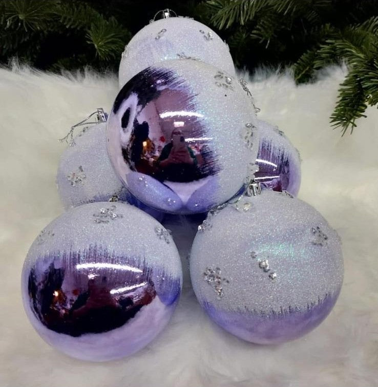 Adaugă o notă regală bradului tău cu acest set de 6 globuri mov de Crăciun, decorate cu sclipici irizat și accente florale argintii. Reflexiile mov-metalizat oferă un efect elegant și misterios, perfect pentru un decor modern și sofisticat.