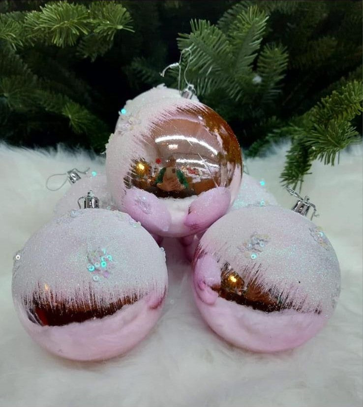 Adu un aer delicat și elegant bradului tău cu acest set de 6 globuri roz pudrat, decorate cu sclipici irizat și reflexii metalice aurii. Combinația subtilă de roz și auriu creează o atmosferă caldă, rafinată și romantică, perfectă pentru sărbători moderne sau clasice.