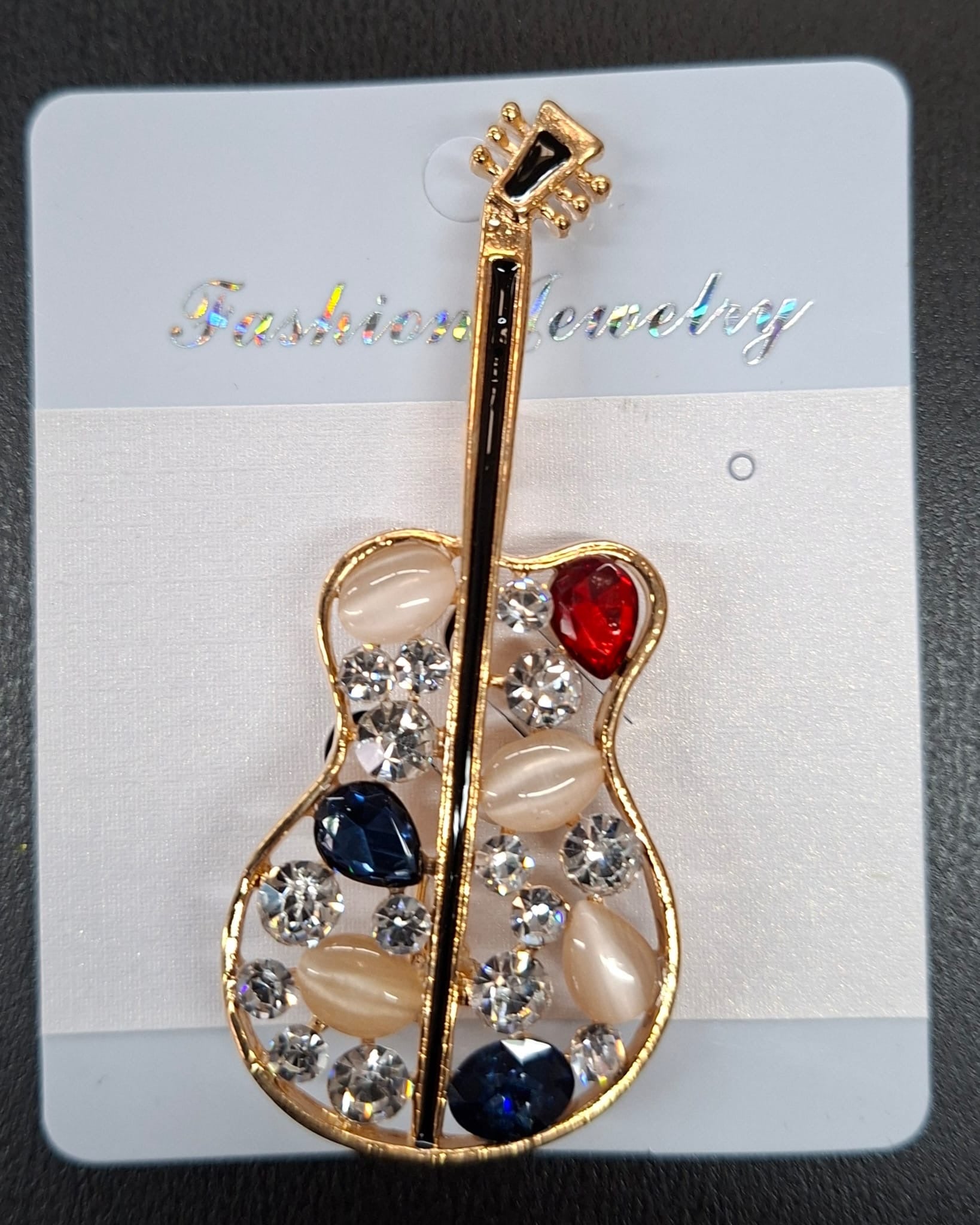 Broșa Vioară cu stras este un accesoriu rafinat, inspirat din lumea muzicii și a eleganței clasice. Realizată din aliaj metalic cu finisaj auriu, broșa este decorată cu cristale transparente, pietre decorative opalescente și accente colorate, care oferă un efect vizual sofisticat.
