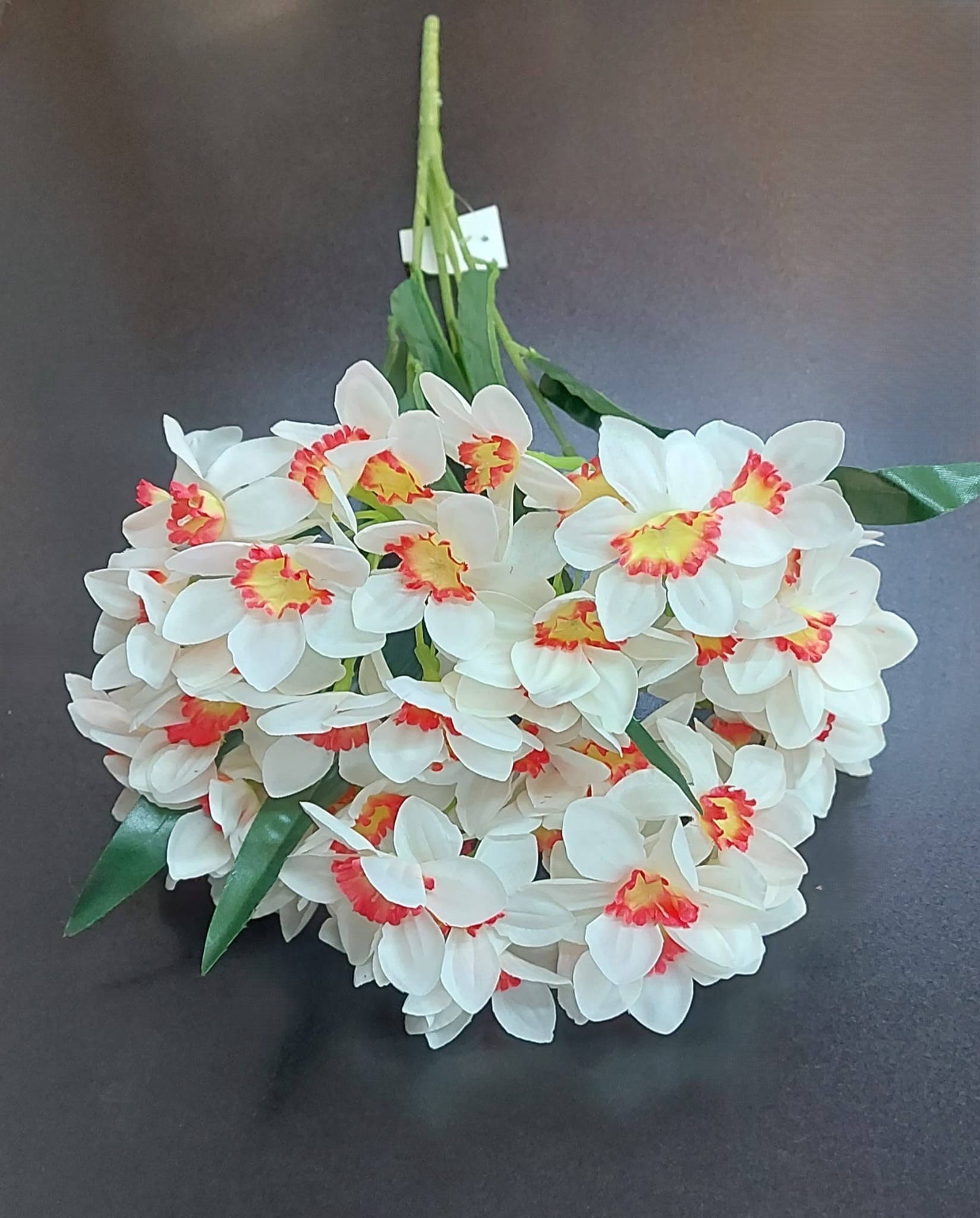 Buchetul de narcise artificiale albe cu centru galben-roșu, este realizat din plastic de calitate, oferind un aspect decorativ plin de contrast și rezistență ridicată în timp. Florile au petale albe bine definite, cu centru galben intens conturat cu accente roșii, creând un efect vizual deosebit și vibrant.