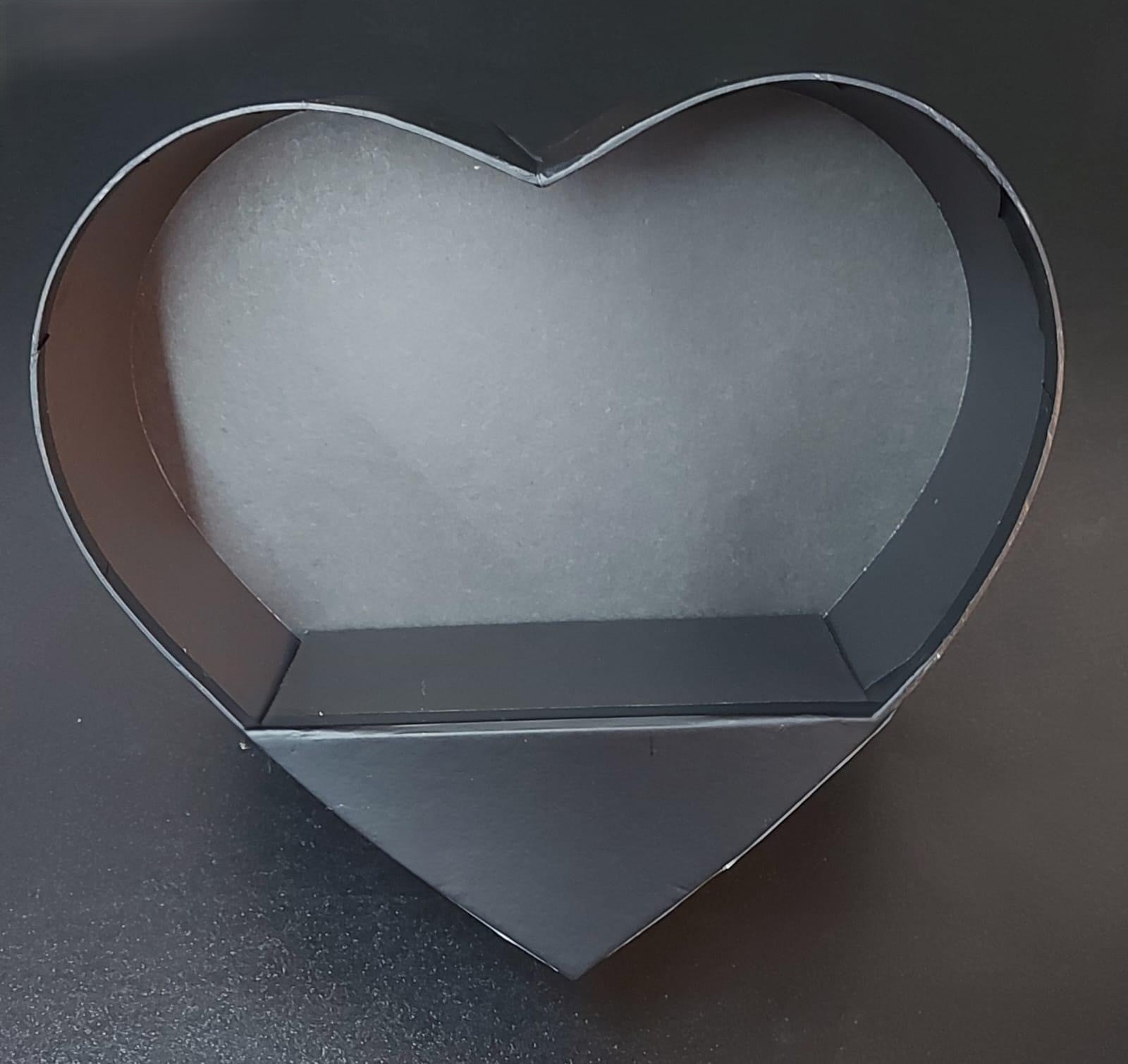 Cutie din carton în formă de inimă, culoare neagră, cu dimensiunea de 20 × 24 cm, ideală pentru aranjamente florale moderne, cadouri premium sau decoruri cu impact vizual puternic. Designul sobru și elegant o face potrivită pentru evenimente speciale, surprize rafinate sau aranjamente florale de lux.