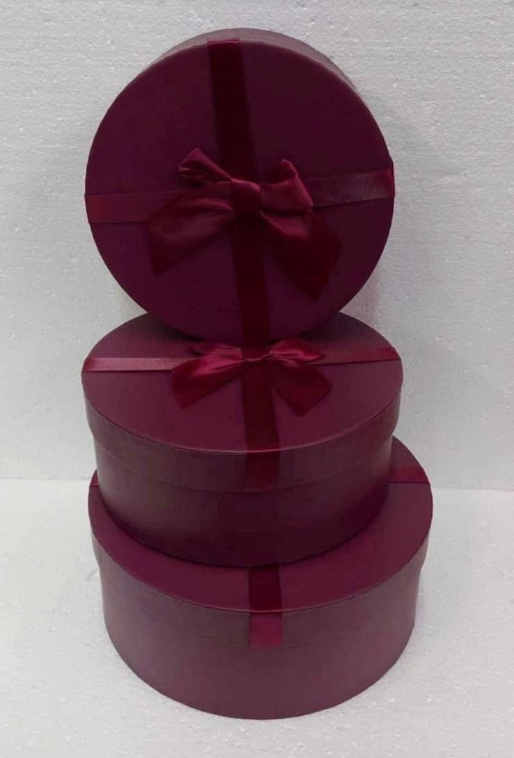 Set format din 3 cutii din carton, cu formă rotundă, culoare bordo, decorate cu panglică și fundă asortată, ideale pentru aranjamente florale, cadouri sau prezentări cu un aer sofisticat. Nuanța bordo oferă un aspect elegant și rafinat, potrivit pentru evenimente speciale, cadouri premium sau decoruri deosebite.