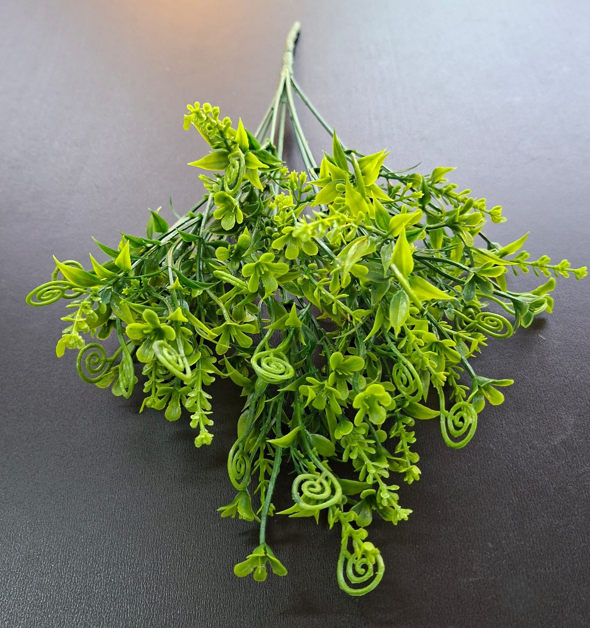 Ramură de verdeață artificială decorativă cu frunze mici și detalii spiralate, în nuanțe proaspete de verde deschis. Designul bogat și aerisit oferă volum și dinamism aranjamentelor florale, fiind ideală pentru vaze, ghivece, decor interior sau proiecte creative. Nu necesită întreținere și își păstrează aspectul în timp.