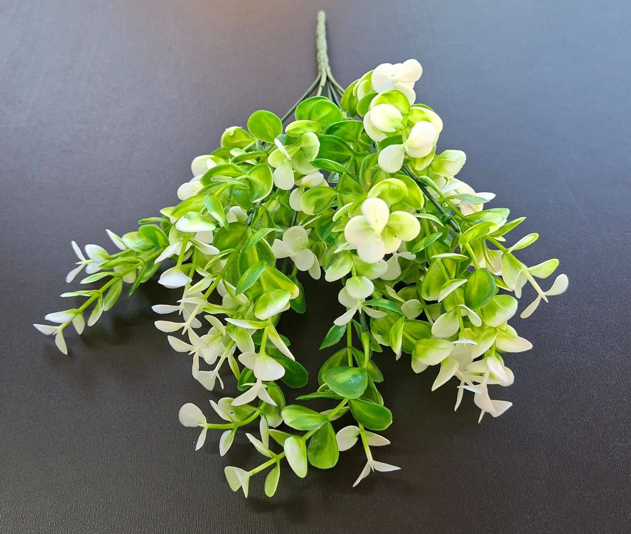 Ramură de verdeață artificială decorativă cu frunze mici, rotunjite, în combinație armonioasă de verde proaspăt și alb-crem. Aspectul luminos și natural o face ideală pentru aranjamente florale elegante, decoruri moderne, vaze, ghivece sau evenimente speciale. Tulpinile flexibile permit modelarea ușoară, fără întreținere.