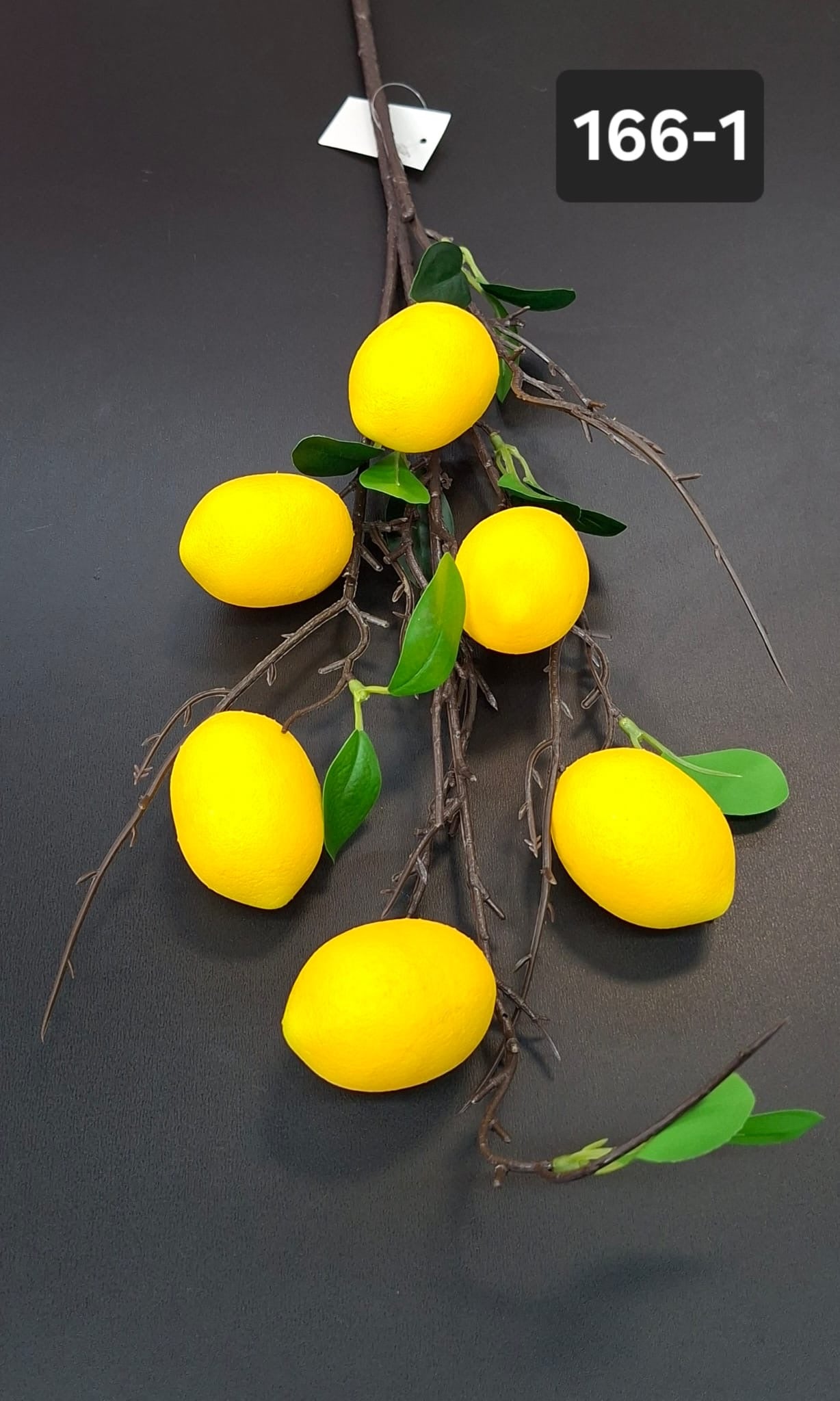 Ramură decorativă artificială cu lămâi galbene, frunze verzi și crenguțe brune, ideală pentru aranjamente de vară, decoruri tematice mediteraneene sau vitrine de sezon. Lămâile au un aspect realist și un finisaj mat. Lungimea totală este de 85cm, perfectă pentru vase, panouri florale sau decoruri creative.