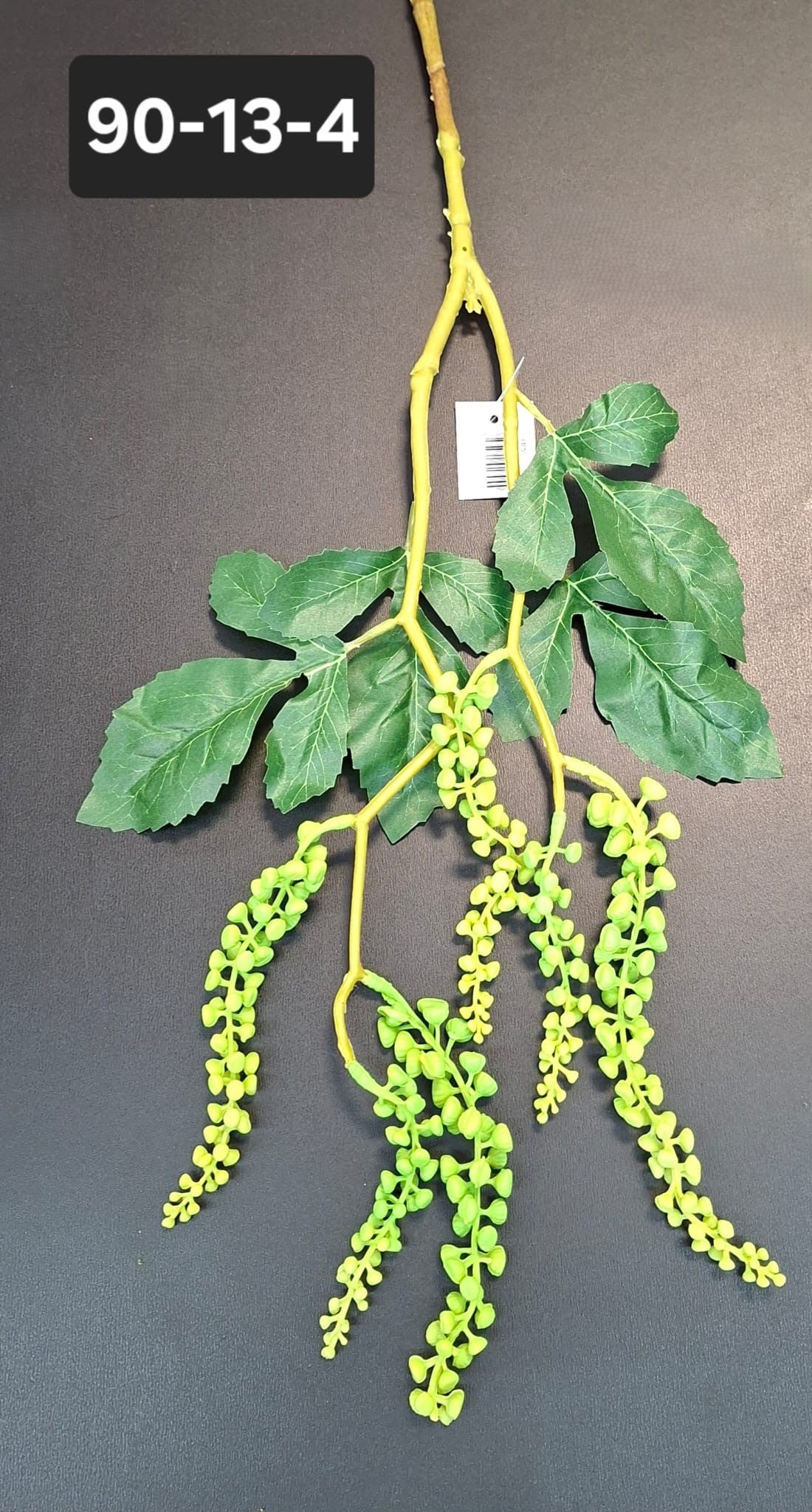 Ramură artificială cu aspect natural, prevăzută cu frunze bogate și ciorchini verzi decorativi. Ideală pentru aranjamente florale suspendate, buchete de toamnă sau decoruri verzi în vitrine, evenimente sau spații interioare. Fabricată din materiale rezistente, ușor de modelat.