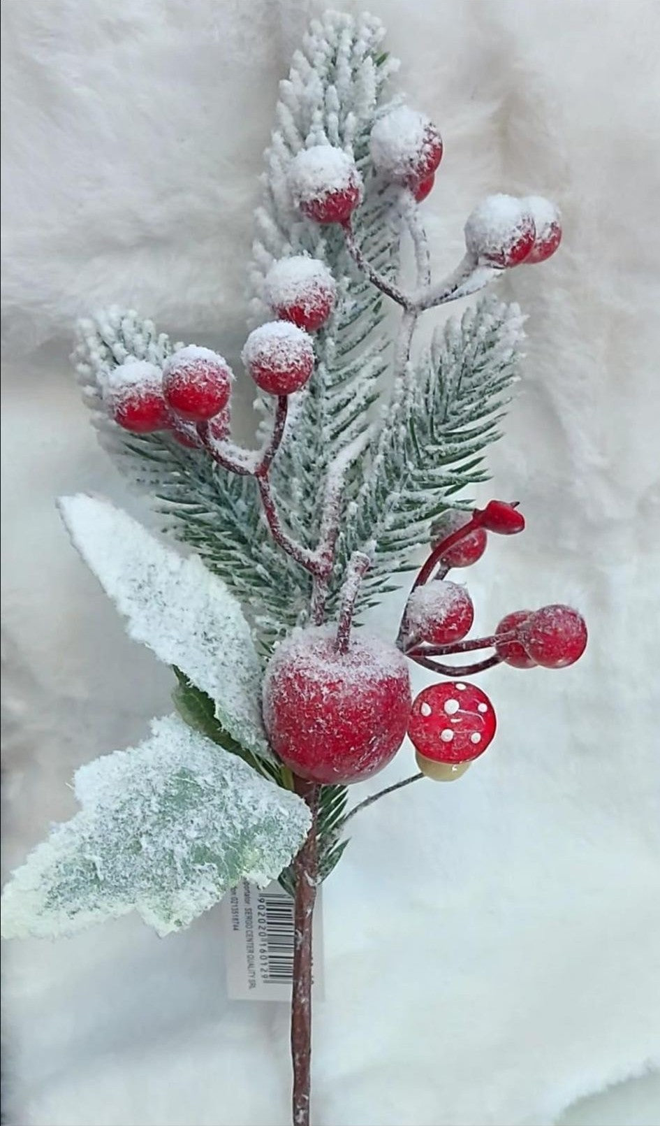 Crenguță artificială de Crăciun, 30cm, cu brad cu zăpadă, măr decorativ, fructe roșii și ciupercuță, ideală pentru aranjamente și decorațiuni festive. 10/set