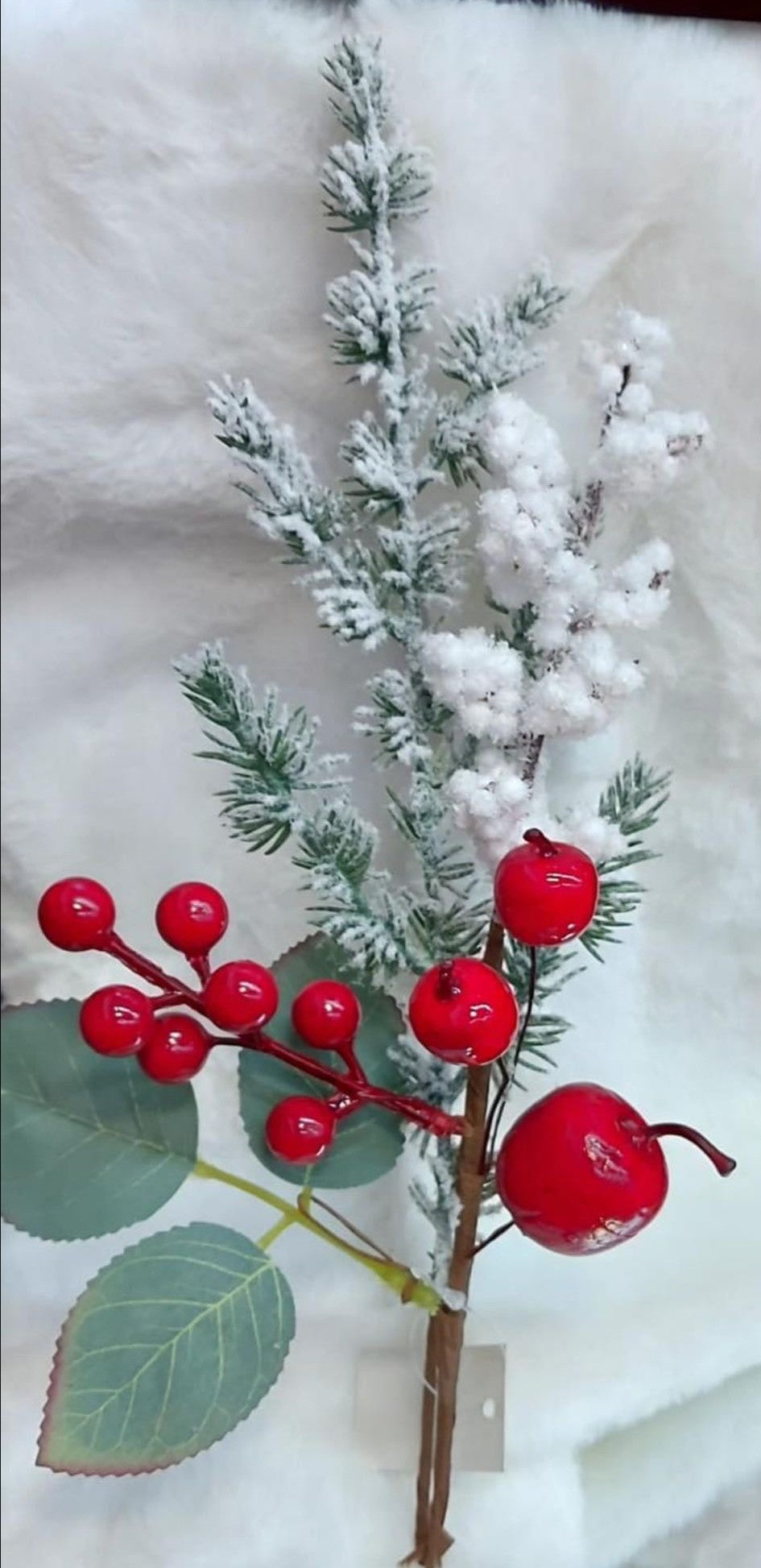 Crenguță artificială de Crăciun, 30cm, cu ramuri de brad cu zăpadă, mere roșii decorative și bobițe, ideală pentru aranjamente și decorațiuni festive. 10/set