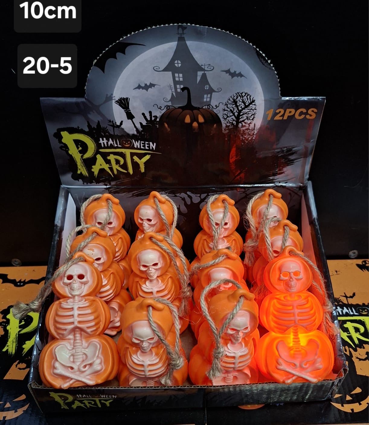 Adaugă un plus de mister și înfricoșare decorului tău de Halloween cu acest set de 12 figurine schelet în dovleac cu LED! Realizate din plastic rezistent, fiecare figurină de 10 cm are șnur pentru agățare și luminează portocaliu, fiind perfecte pentru decorarea casei, a vitrinelor sau pentru petreceri tematice.