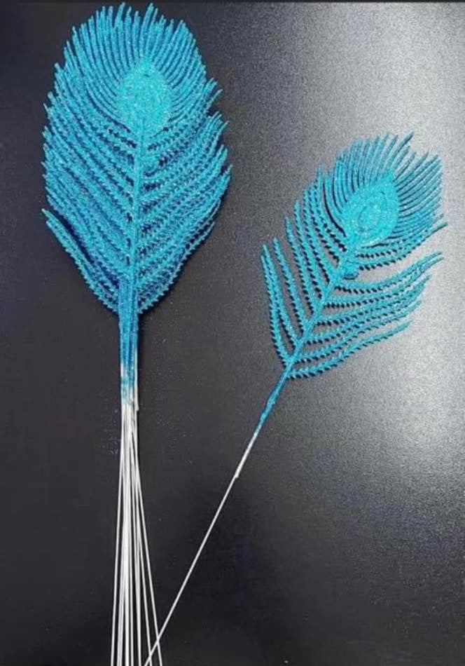 Set de 12 frunze decorative albastre cu sclipici strălucitor, realizate în formă elegantă de pană de păun. Sunt perfecte pentru aranjamente florale, buchete, decoruri de nuntă, evenimente festive sau proiecte DIY. Strălucirea lor oferă un efect deosebit și un plus de rafinament oricărui decor.