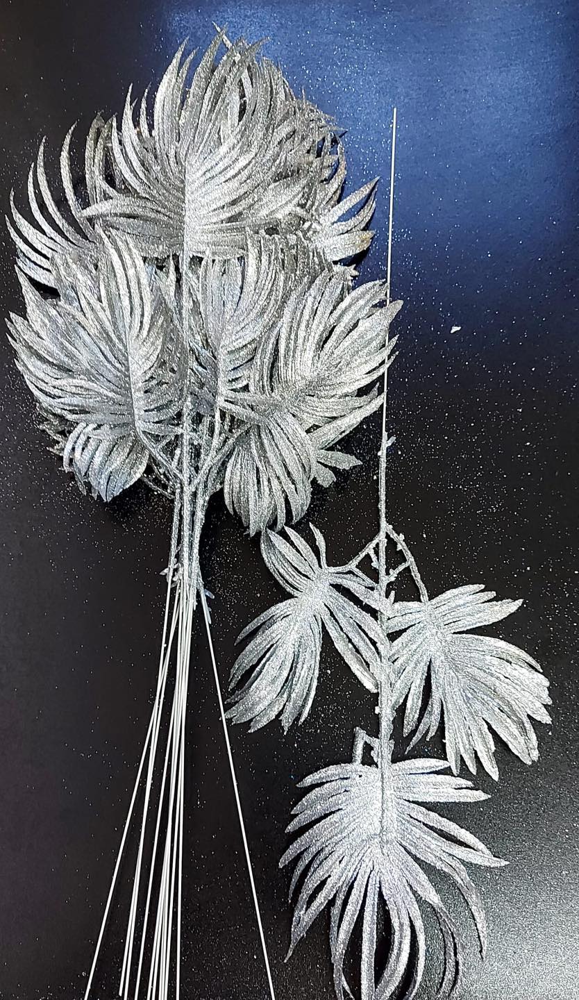 Set de 12 frunze decorative palmier exotic, culoare argintiu strălucitor cu sclipici. O alegere elegantă pentru aranjamente florale, decoruri festive de Crăciun, evenimente speciale sau proiecte creative DIY. Aspect luxos și rafinat, perfect pentru combinații contrastante.