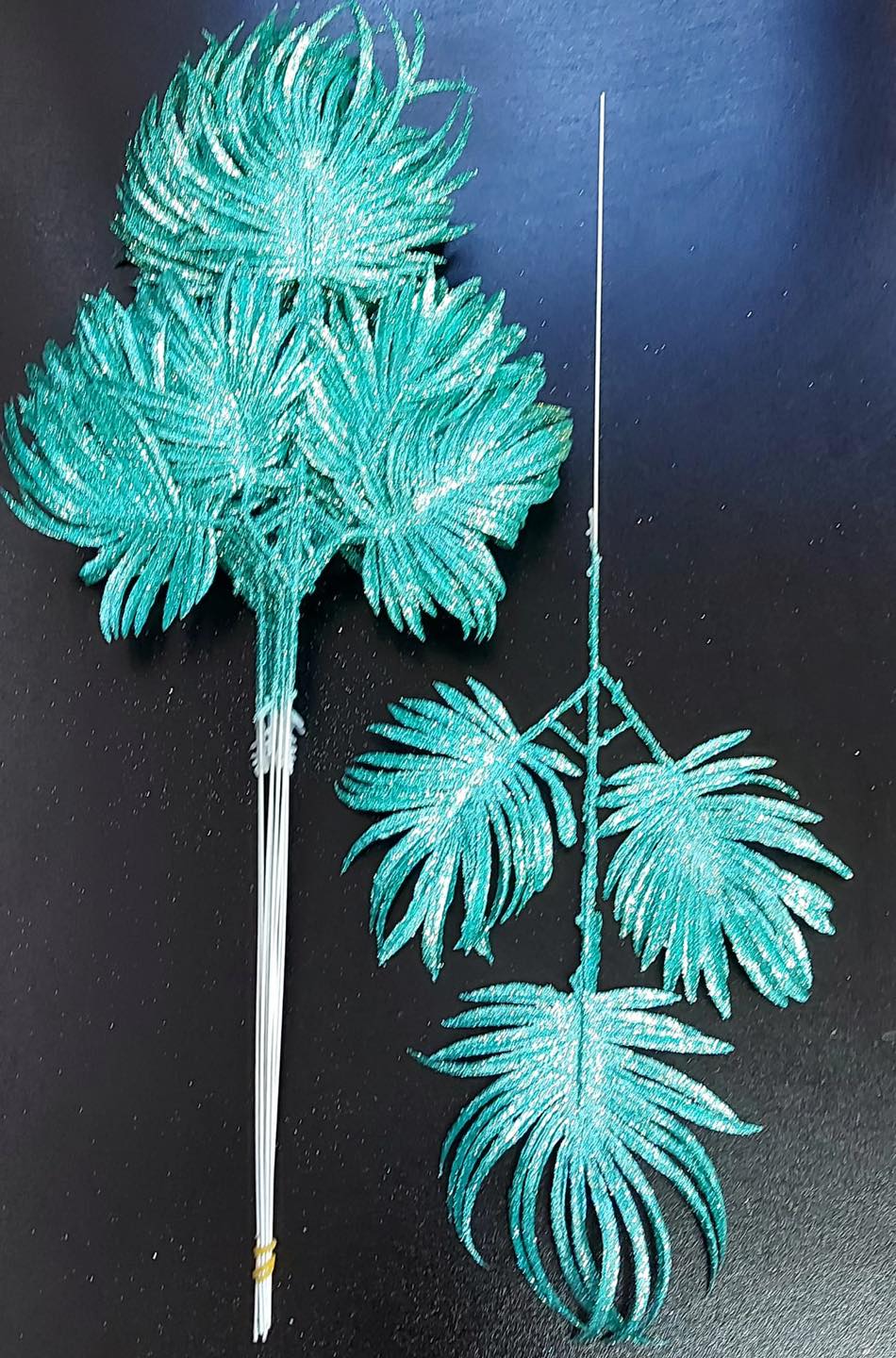 Set de 12 frunze decorative palmier exotic, culoare verde cu sclipici. Potrivite pentru aranjamente florale spectaculoase, decoruri de evenimente, proiecte creative și accente elegante. Efect vizual luxuriant și strălucitor, ideal pentru decoruri moderne și sofisticate.