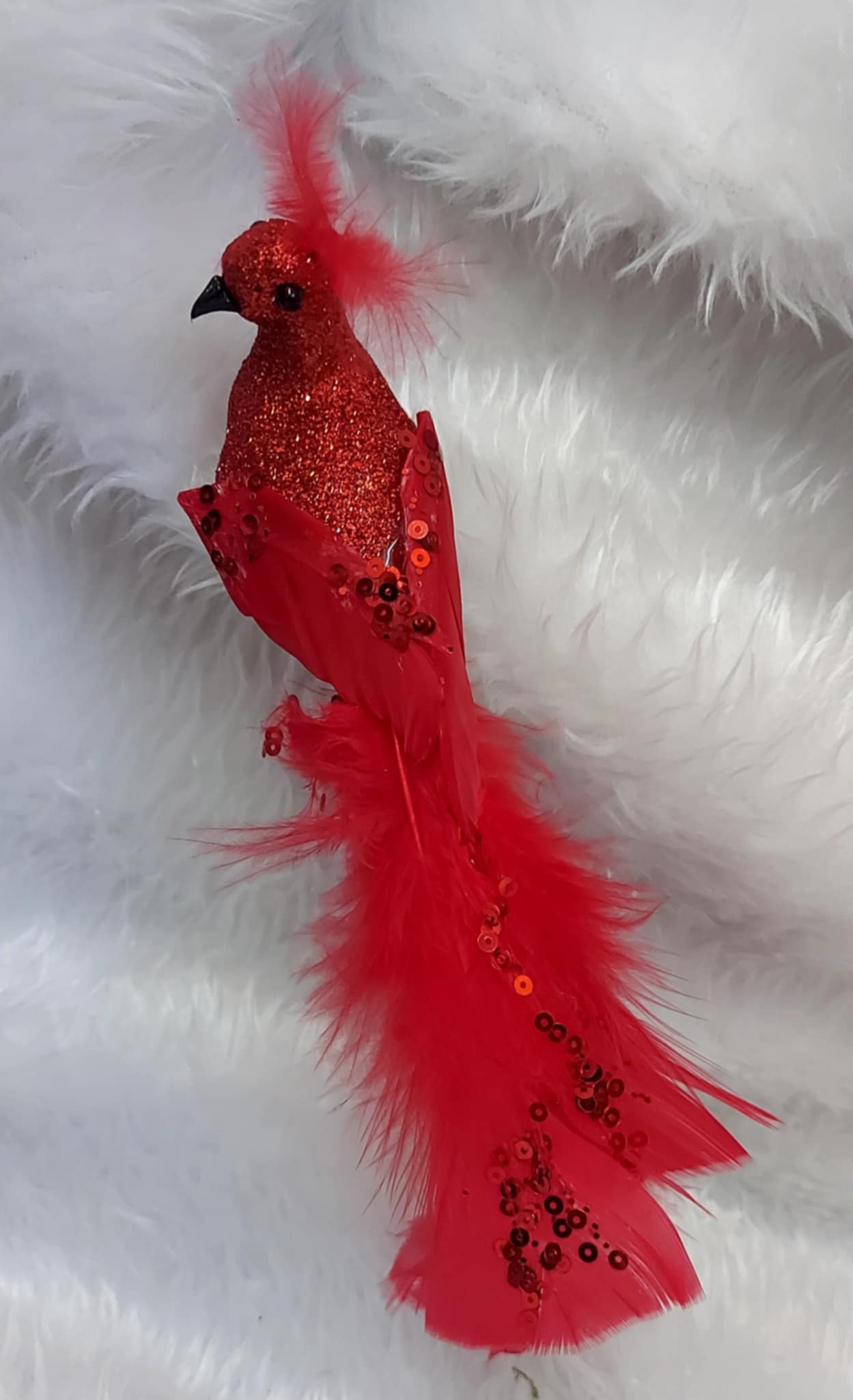 Adu un plus de eleganță și spectaculozitate bradului de Crăciun cu această pasăre roșie decorativă, cu corp sclipitor, aripi cu paiete și coadă lungă din pene bogate. O decorațiune deosebită, care atrage privirile și transformă orice aranjament festiv într-un decor de poveste.