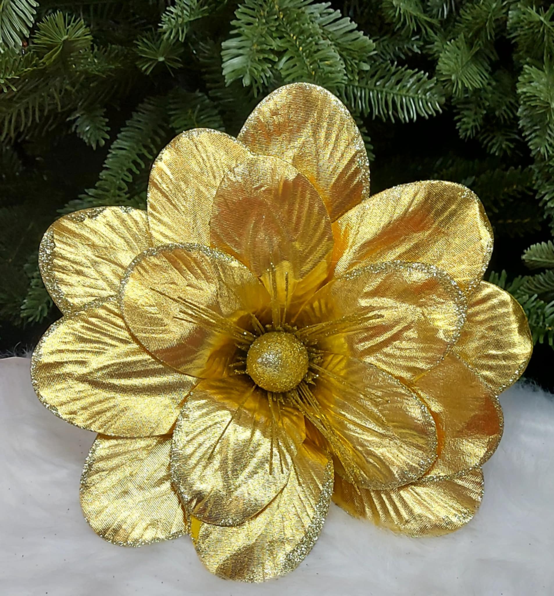 Adaugă un plus de eleganță și strălucire bradului tău cu acest set de 10 flori decorative aurii de Crăciun. Realizate din material textil cu finisaj metalizat și centru sclipitor, aceste flori se prind ușor în brad, coronițe sau aranjamente festive.
