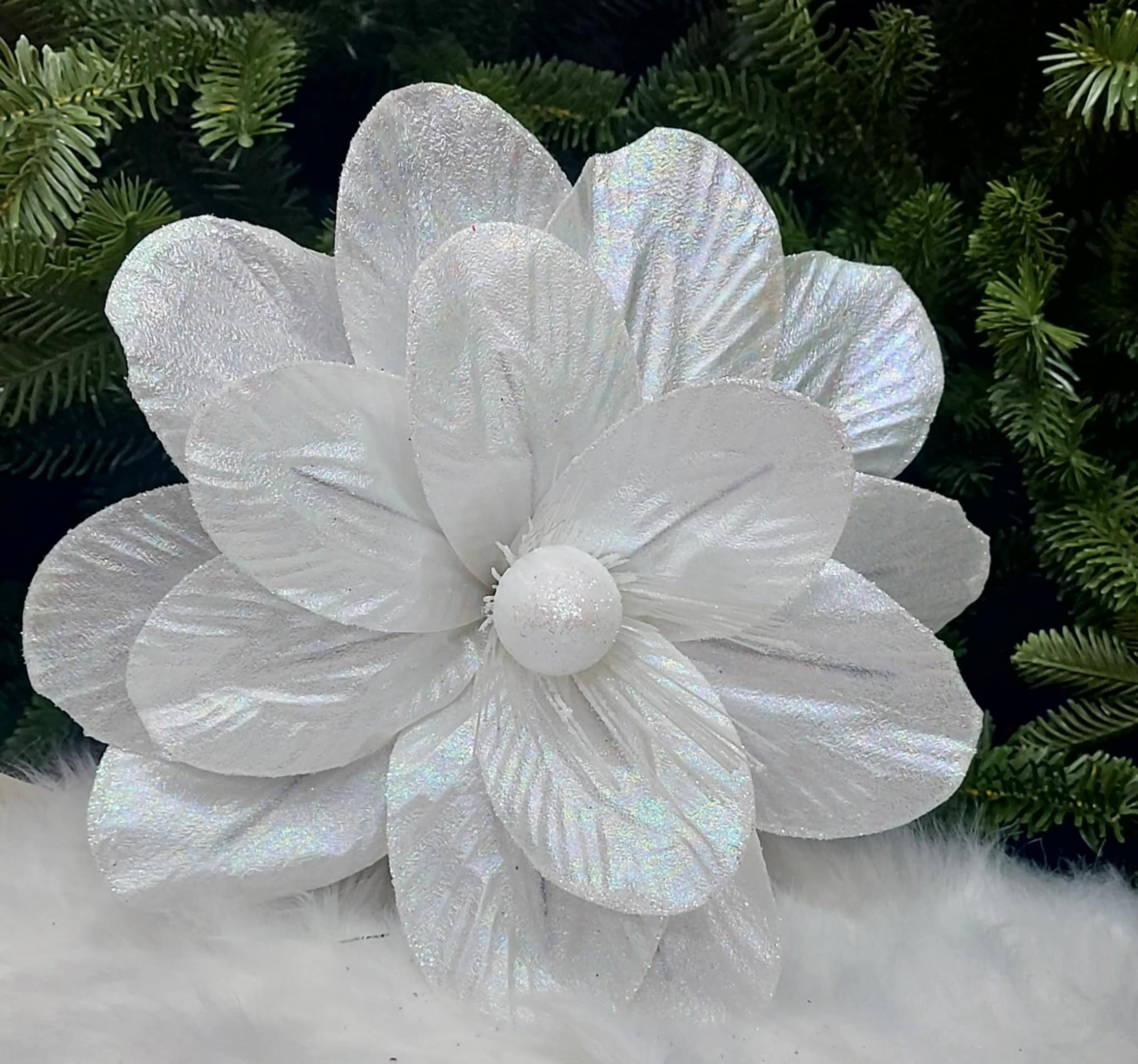 Îmbogățește-ți decorul de sărbători cu acest set de 10 flori albe sidefate pentru Crăciun, elegante și luminoase. Petalele cu reflexii irizate și centru glitter dau un efect magic bradului și aranjamentelor festive.