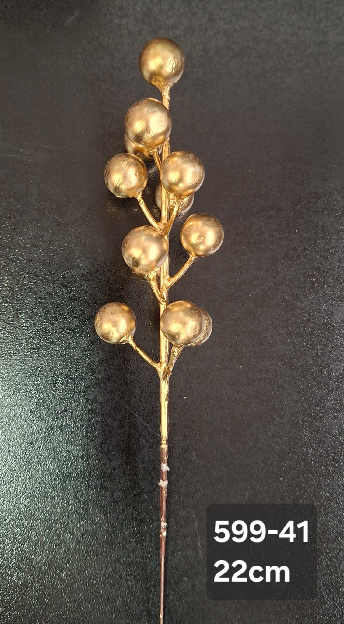 Set de 100 bobițe decorative aurii lucioase, pe tijă de 22 cm. Accesorii elegante pentru brazi de Crăciun, aranjamente florale, coronițe și decorațiuni festive. Oferă un efect strălucitor și rafinat, ideal pentru decoruri premium și proiecte DIY.