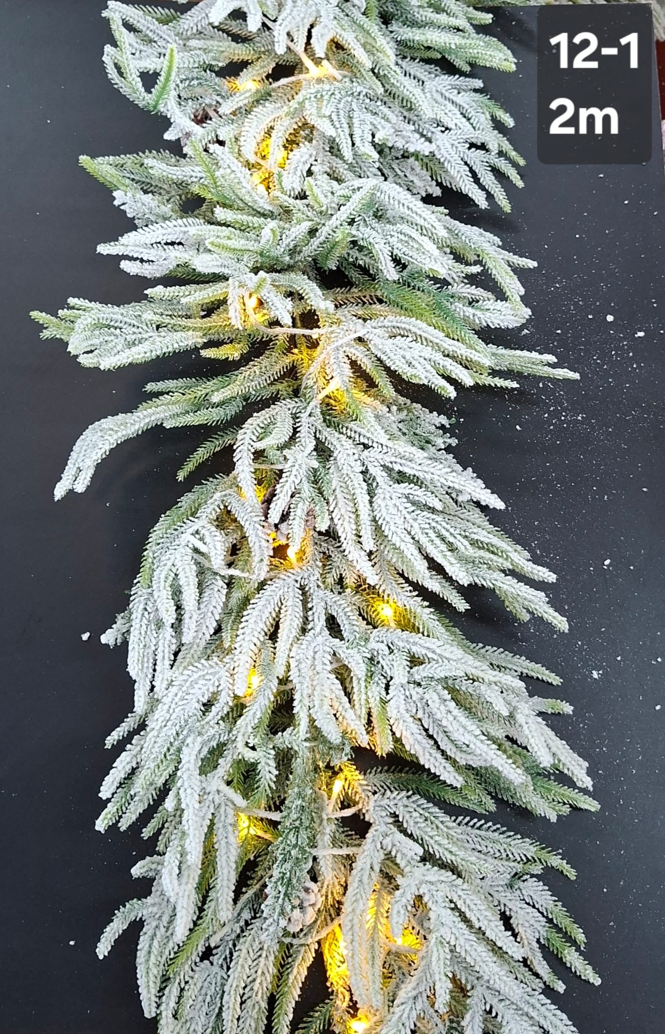 Ghirlandă decorativă de Crăciun cu ramuri bogate acoperite cu zăpadă artificială și lumini calde LED integrate, ideală pentru decorarea ușilor, ferestrelor, șemineelor sau meselor festive. Creează o atmosferă elegantă și luminoasă, specifică sărbătorilor de iarnă.