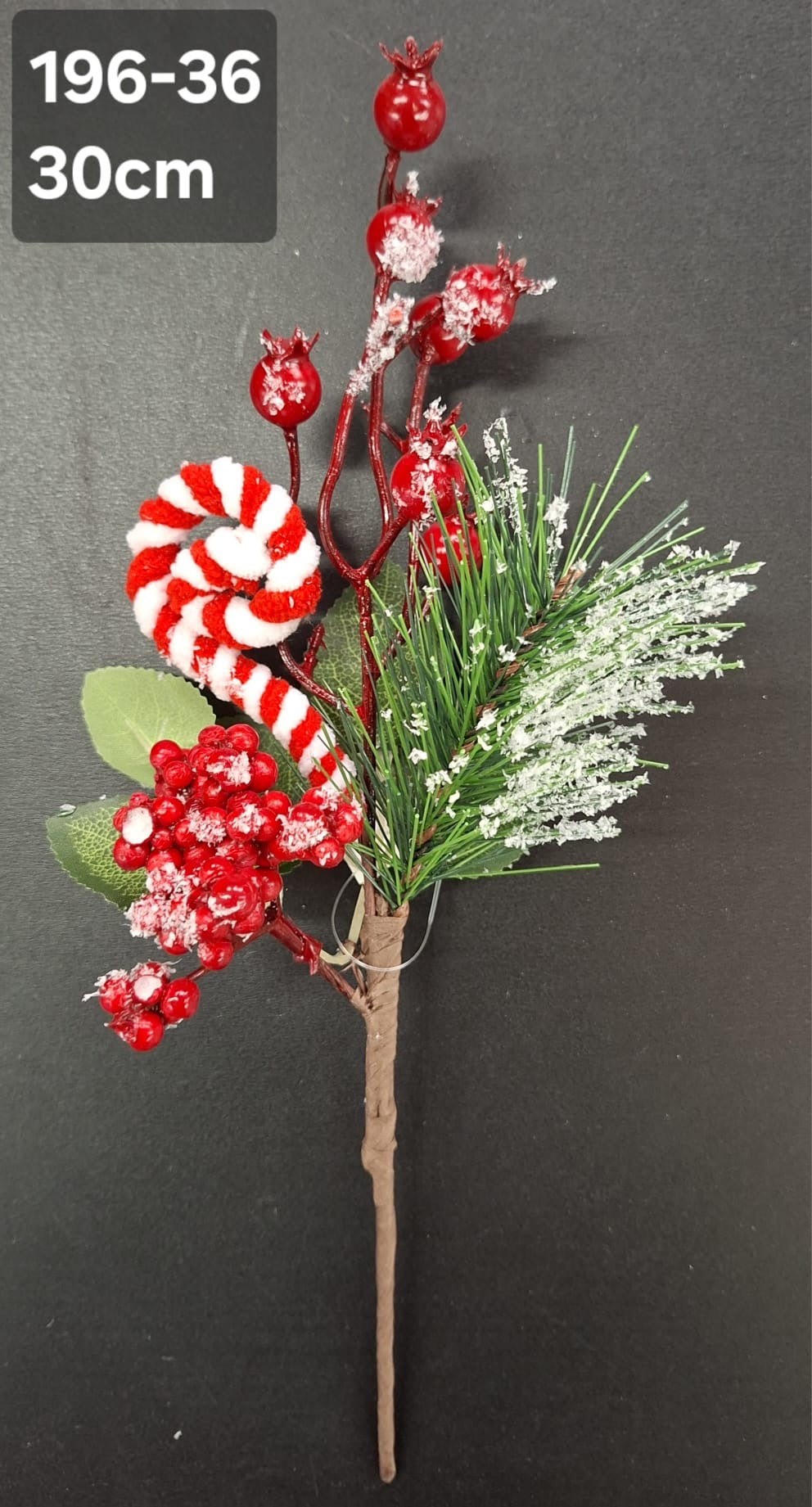 Crenguță decorativă veselă și colorată, cu acadea alb-roșie, bobițe roșii înghețate și frunze verzi acoperite cu zăpadă artificială. Ideală pentru aranjamente de Crăciun, coronițe, brazi mici sau decoruri de masă tematice. Adaugă un accent dulce și festiv oricărui decor.