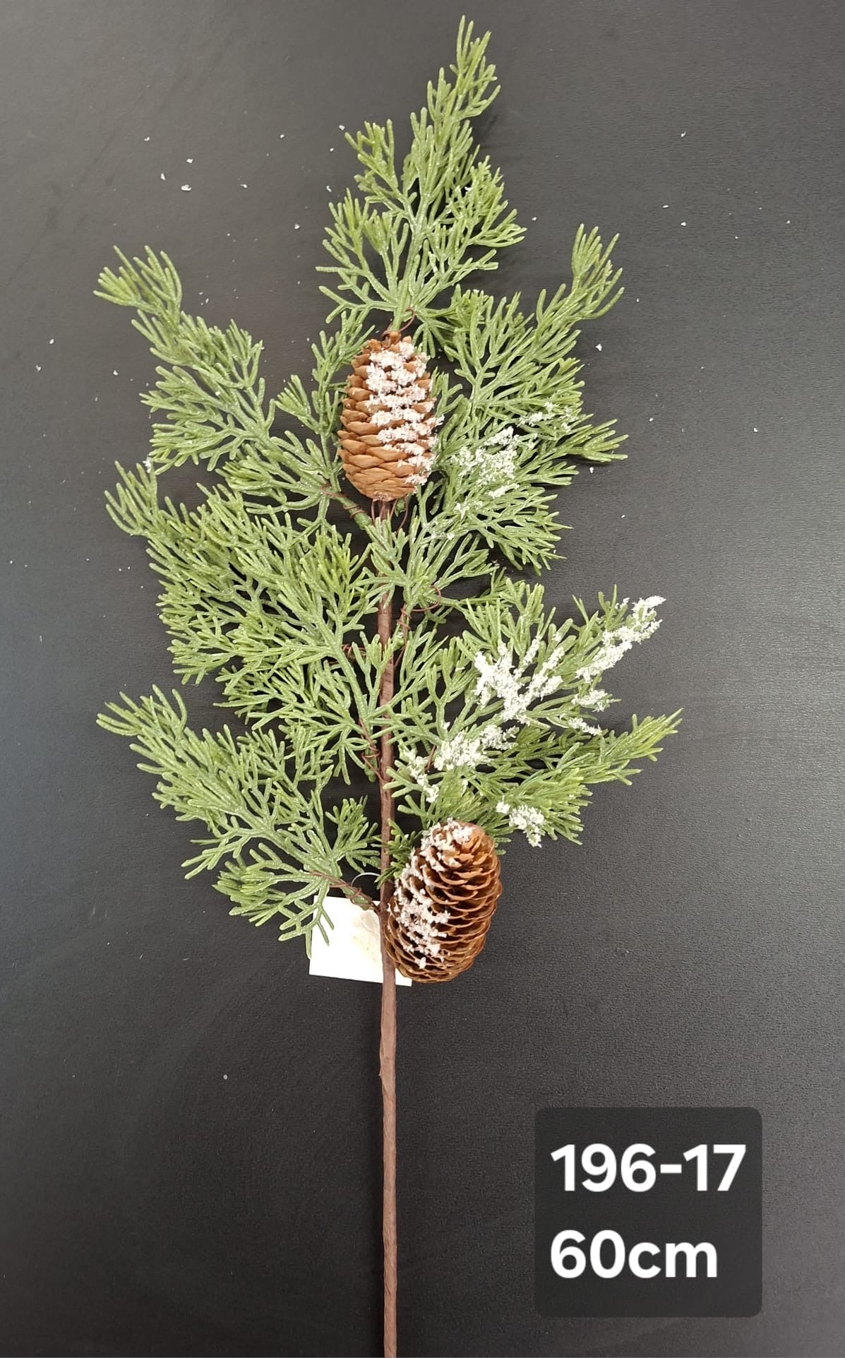 Crenguță decorativă elegantă, cu frunze verzi de brad artificial și conuri naturale acoperite cu zăpadă artificială. Ideală pentru aranjamente festive, brazi, coronițe sau decoruri de masă. Adaugă o notă autentică și naturală decorațiunilor tale de iarnă.