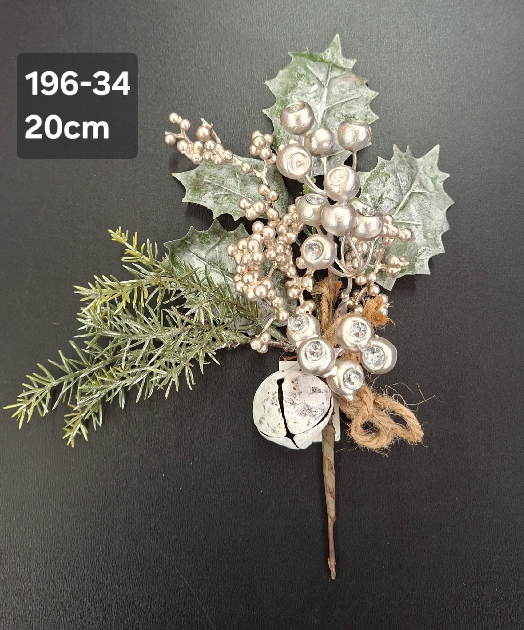 Crenguță elegantă de Crăciun, decorată cu frunze de ilex argintii, bobițe perlate și clopoțel rustic, ideală pentru aranjamente festive, brazi mici, coronițe sau decoruri de masă. Aspectul ușor înghețat adaugă un farmec rafinat decorațiunilor tale de iarnă.