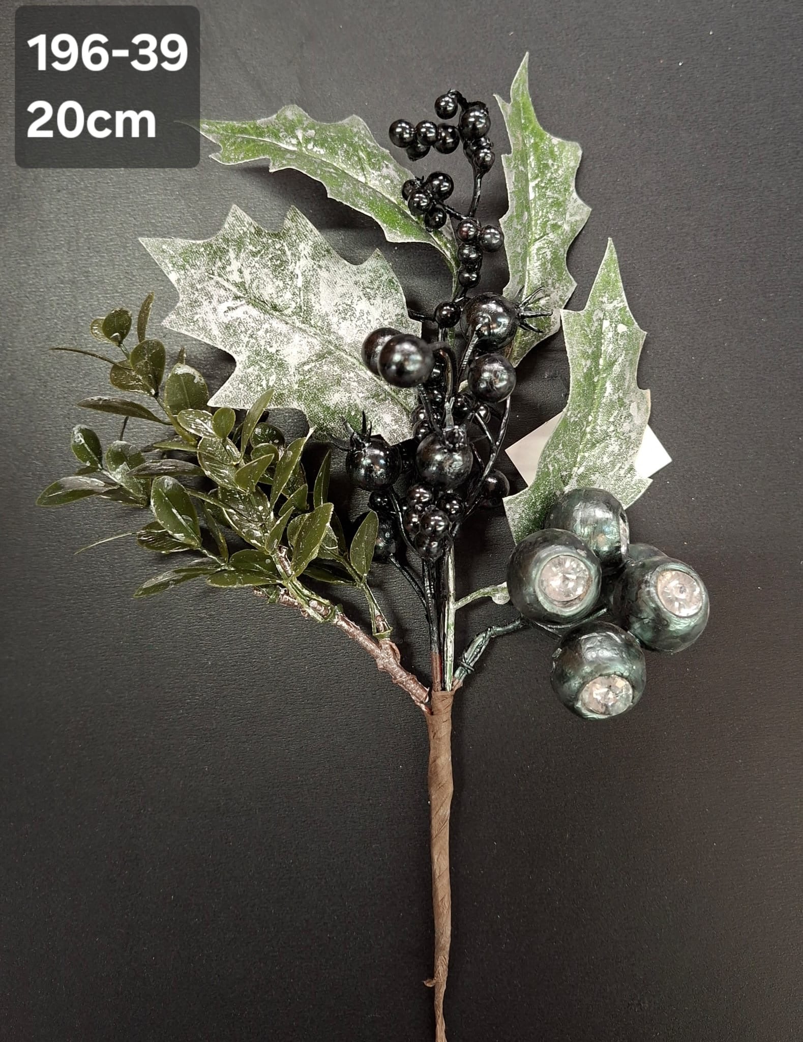 Crenguță decorativă elegantă cu frunze verzi de ilex ușor ninse și bobițe negre lucioase, ideală pentru decoruri de iarnă rafinate. Perfectă pentru aranjamente de Crăciun, coronițe, brazi miniaturali sau decoruri de masă.