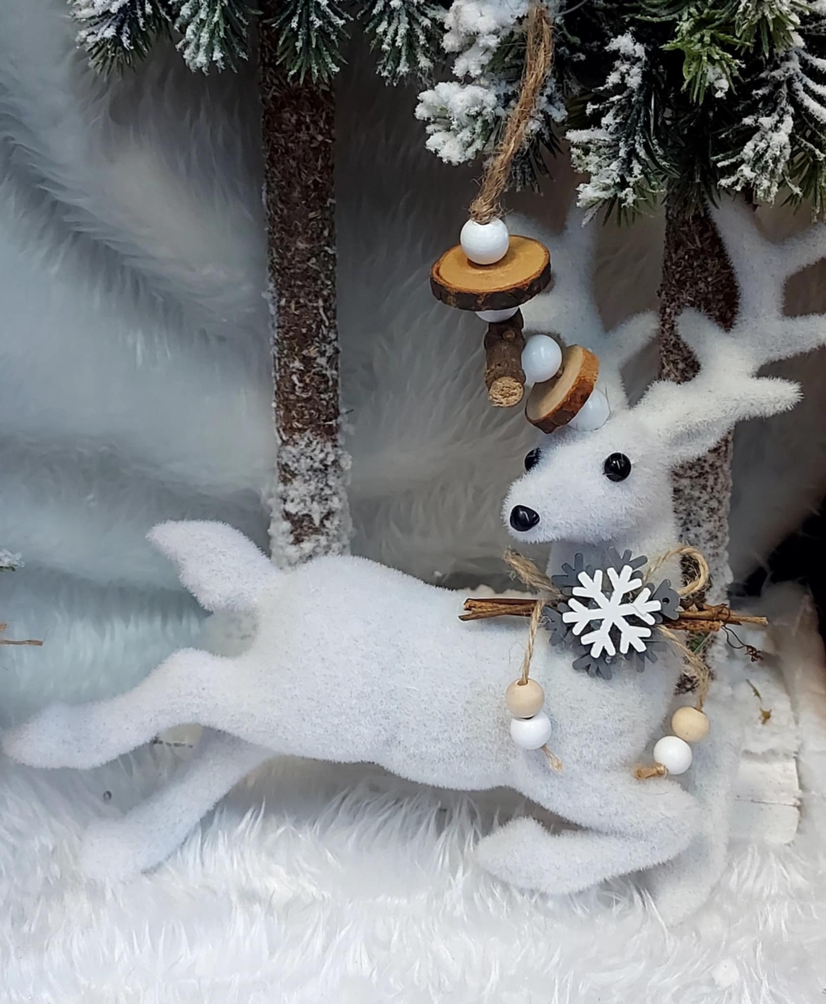 Ren alb pufos de Crăciun, dimensiune 21x20cm, realizat din material moale cu aspect de catifea și decorat cu fulg de nea din lemn, mărgele naturale și sfoară rustică. Designul dinamic al renului în alergare adaugă viață oricărui decor de iarnă — perfect pentru vitrine, mese festive, șeminee sau aranjamente tematice. Ideal pentru decoruri nordice, elegante sau rustice.
