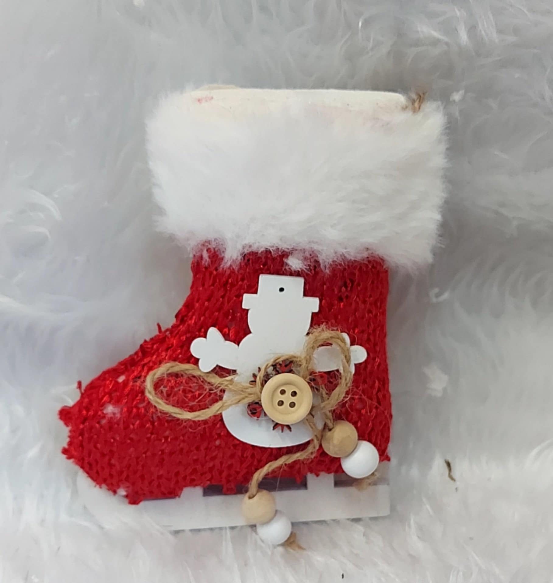 Ornament decorativ de Crăciun în formă de patină, realizat din material tricotat roșu, cu margine pufoasă din blăniță albă și decor rustic din sfoară, mărgele și figură de om de zăpadă. Designul său adorabil adaugă un aer festiv și jucăuș bradului tău. Perfect pentru decorarea pomului de Crăciun, a rafturilor sau a coronițelor de iarnă.