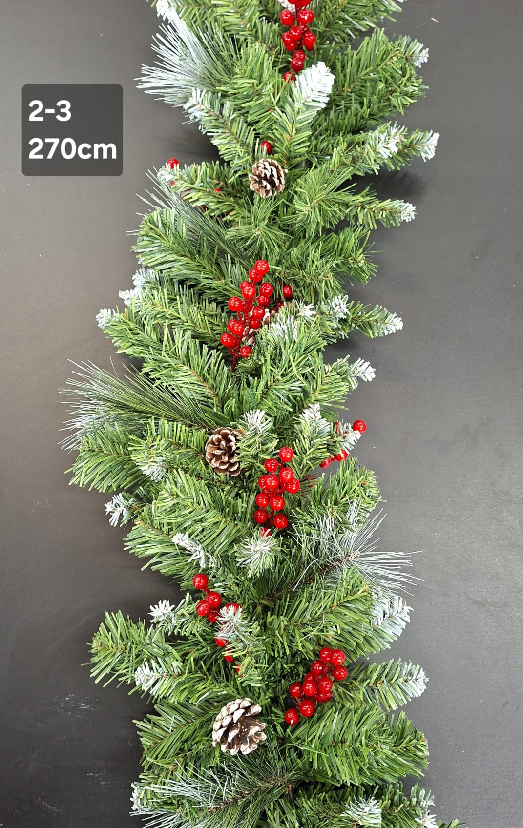 Ghirlandă artificială de Crăciun cu lungimea de 270 cm, realizată din crenguțe verzi dense, accente de zăpadă artificială, conuri naturale și bobițe roșii decorative. Poate fi folosită pentru a împodobi uși, balcoane, scări, șeminee sau vitrine. Aspectul său realist și combinația clasică de culori – verde, roșu și alb – adaugă un aer festiv și elegant oricărui spațiu.