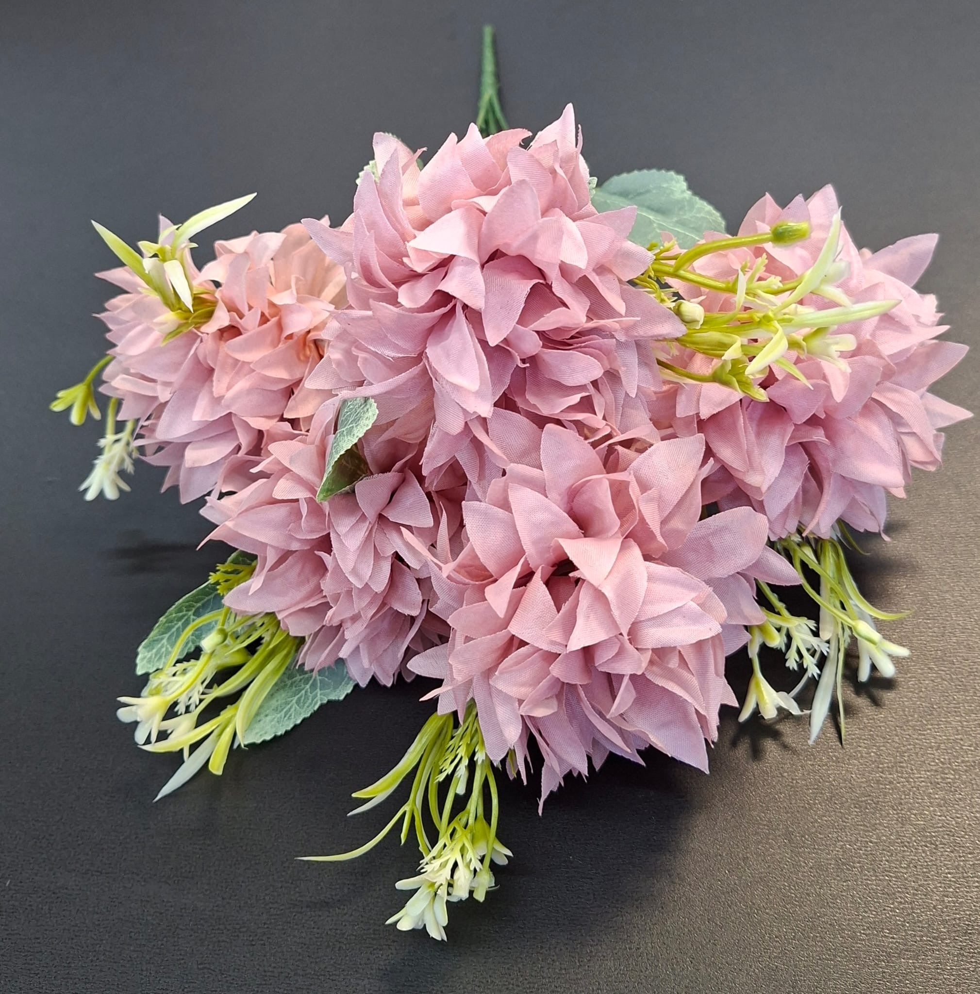 Transformă orice colț al casei tale cu acest buchet artificial cu dalii roz pudrat, ideal pentru decoruri elegante și romantice. Florile au un aspect realist, cu petale fine din material textil și detalii verzi la bază, oferind un plus de naturalețe aranjamentului.