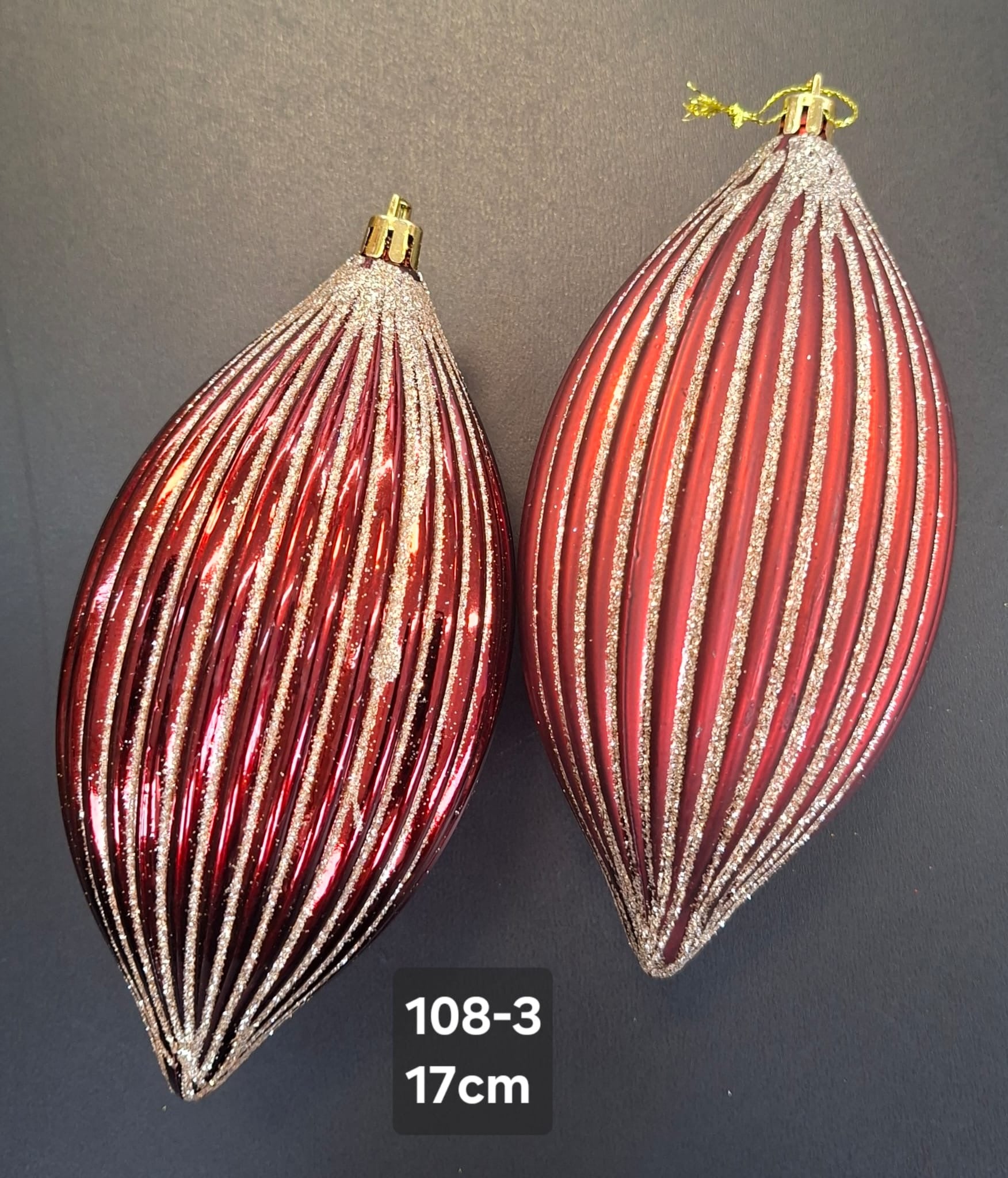 Adaugă eleganță bradului tău de Crăciun cu acest set de 2 globuri decorative alungite, în nuanță roșu metalizat, accentuate cu dungi fine de sclipici argintiu. Realizate din material ușor și rezistent, aceste ornamente de 17 cm oferă un efect rafinat și luminos, perfect pentru un decor festiv modern sau clasic.