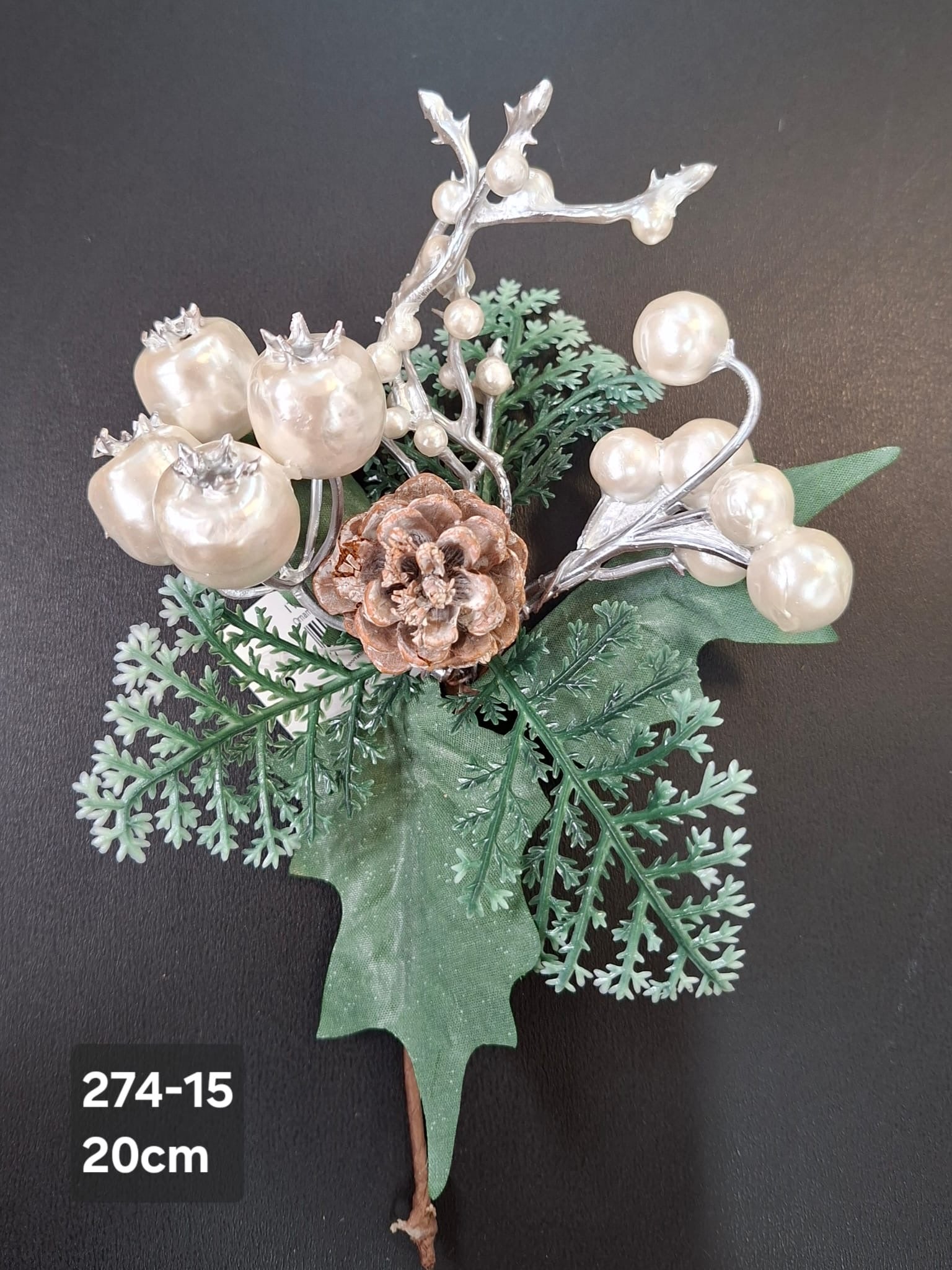 Crenguță decorativă de Crăciun cu fructe sidefate, ramuri argintii și con de brad natural, ideală pentru aranjamente festive, brazi, coronițe sau decorațiuni de masă. Designul elegant combină accentele metalice cu frunzele verzi pentru un efect natural și sofisticat.