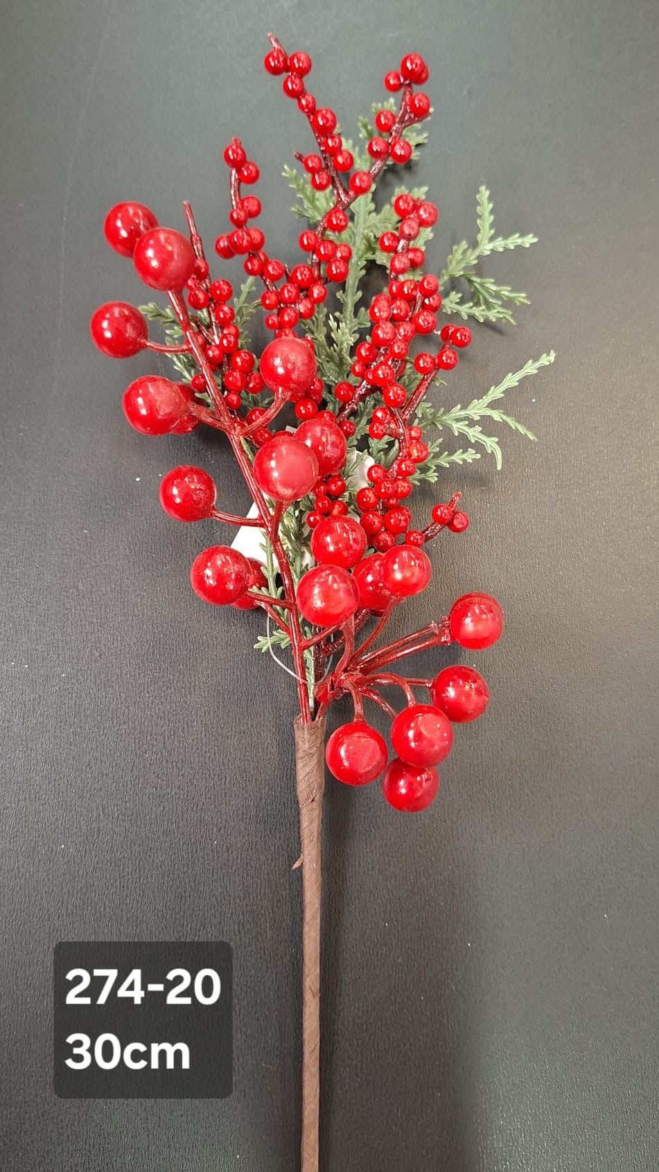 Crenguță decorativă de Crăciun cu bobițe roșii lucioase și frunze verzi, perfectă pentru decorarea bradului, aranjamente festive, coroane sau vaze tematice. Aspectul realist și culorile vii oferă un farmec tradițional și aduc un plus de eleganță decorurilor de iarnă.