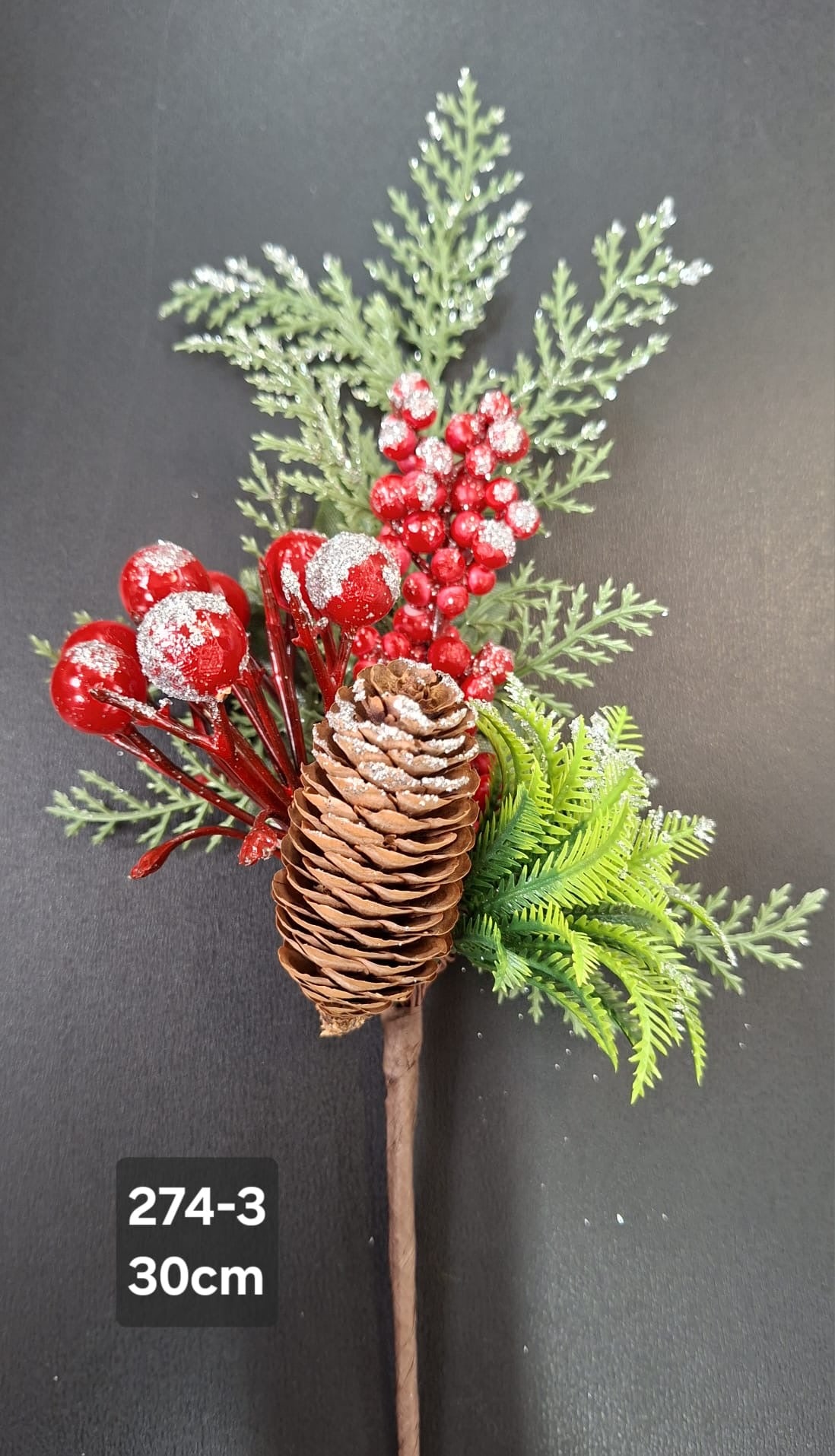 Crenguță decorativă de Crăciun cu con natural, bobițe roșii acoperite cu zăpadă artificială și frunze verzi de brad. Ideală pentru decorarea bradului, coronițe, aranjamente de masă sau proiecte DIY de iarnă. Designul autentic combină texturi naturale și detalii fine pentru un efect elegant și festiv.