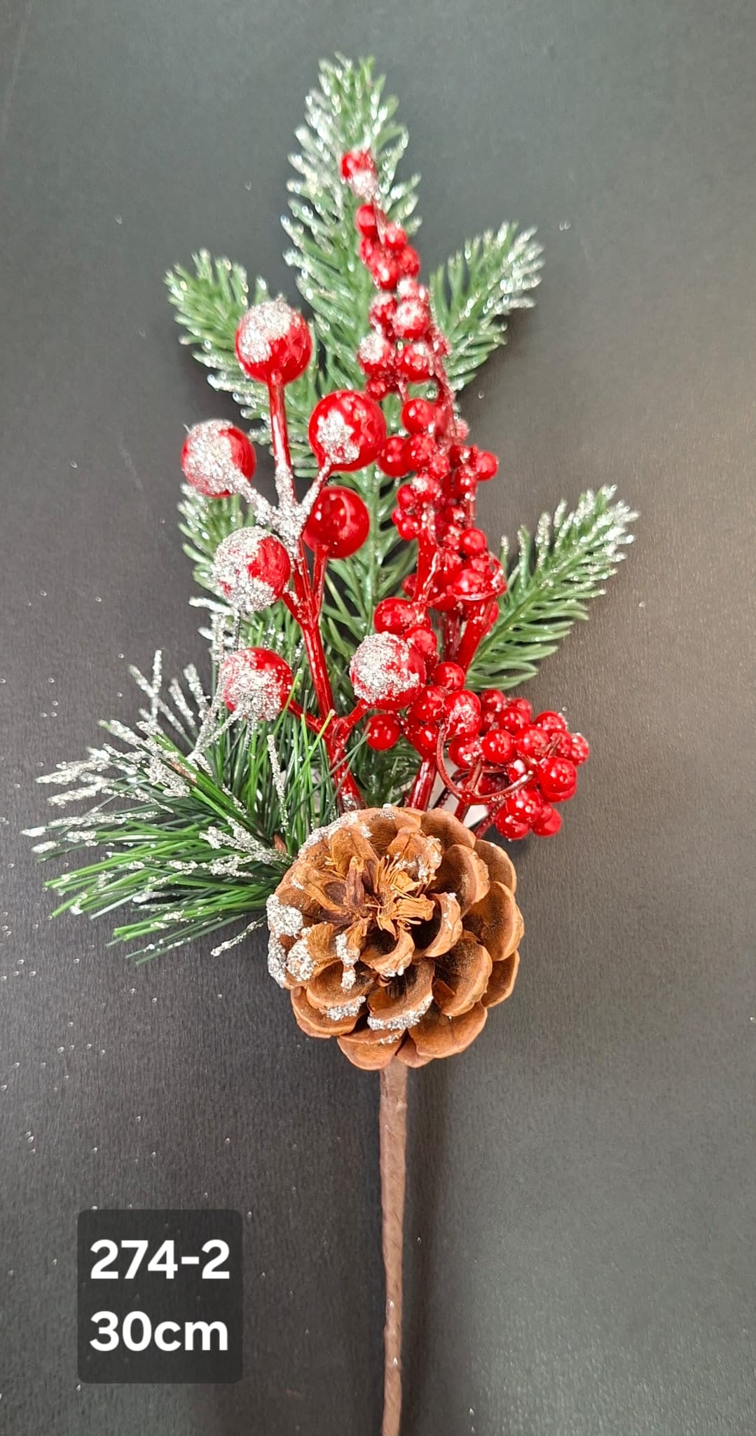 Crenguță decorativă de Crăciun cu bobițe roșii strălucitoare, ace de brad și un con natural cu zăpadă artificială. Ideală pentru decorarea bradului, coronițe, aranjamente de masă sau ghirlande festive. Realizată cu atenție la detalii, oferă un aspect autentic și elegant, potrivit oricărui decor de iarnă.