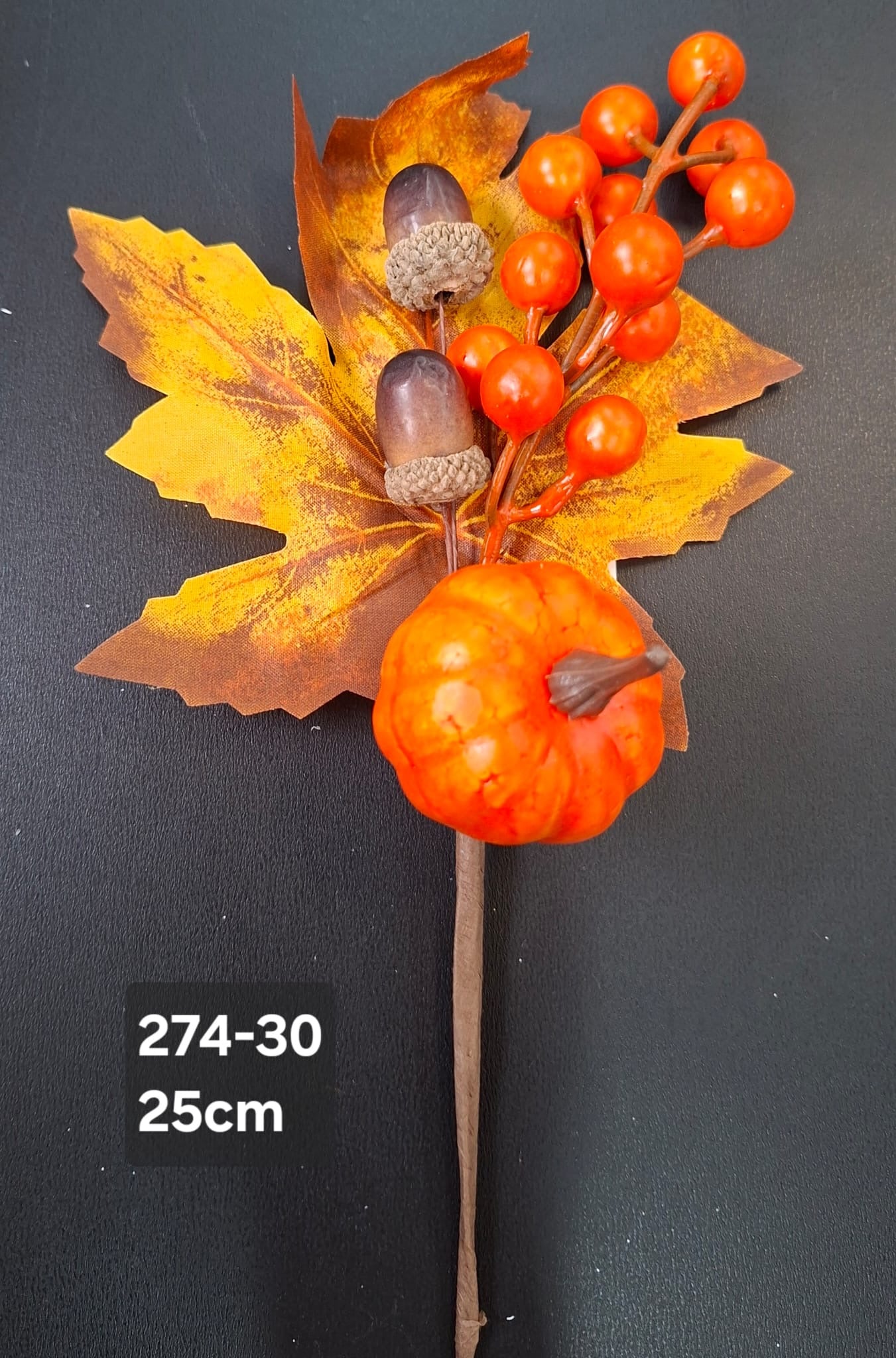 Crenguță artificială de toamnă cu frunze colorate în nuanțe calde, ghinde realiste, bobițe portocalii și un mini dovlecel decorativ. Ideală pentru decorarea meselor, coronițelor, buchetelor sau aranjamentelor de toamnă. Creează o atmosferă caldă și naturală în orice spațiu.
