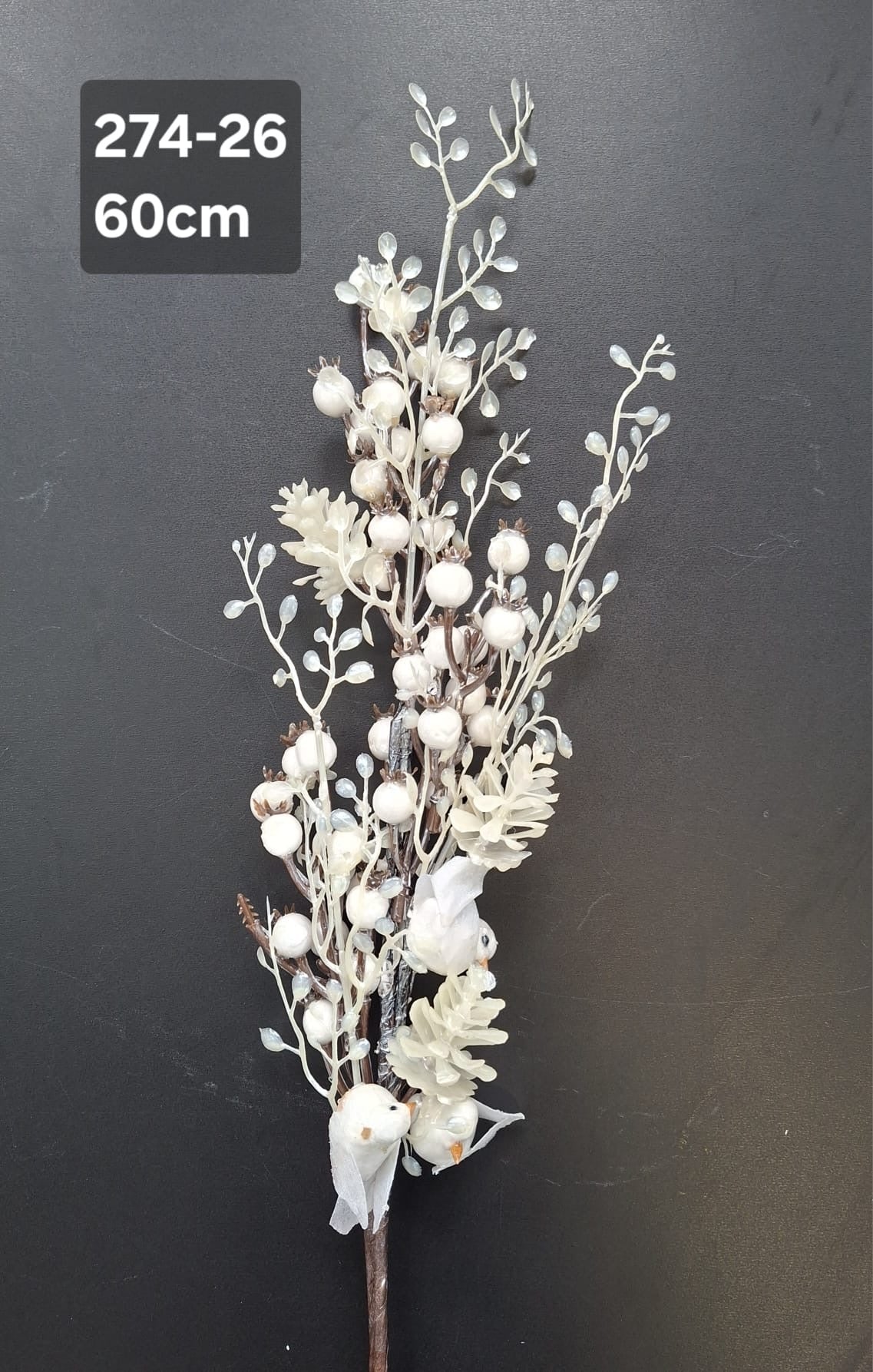 Crenguță decorativă de iarnă, bogată în bobițe albe și cristale translucide, completată de două păsărele delicate. Ideală pentru aranjamente de Crăciun, vitrine festive, decorațiuni de masă sau pentru brad. Oferă un aspect sofisticat și luminos decorului tău de iarnă.