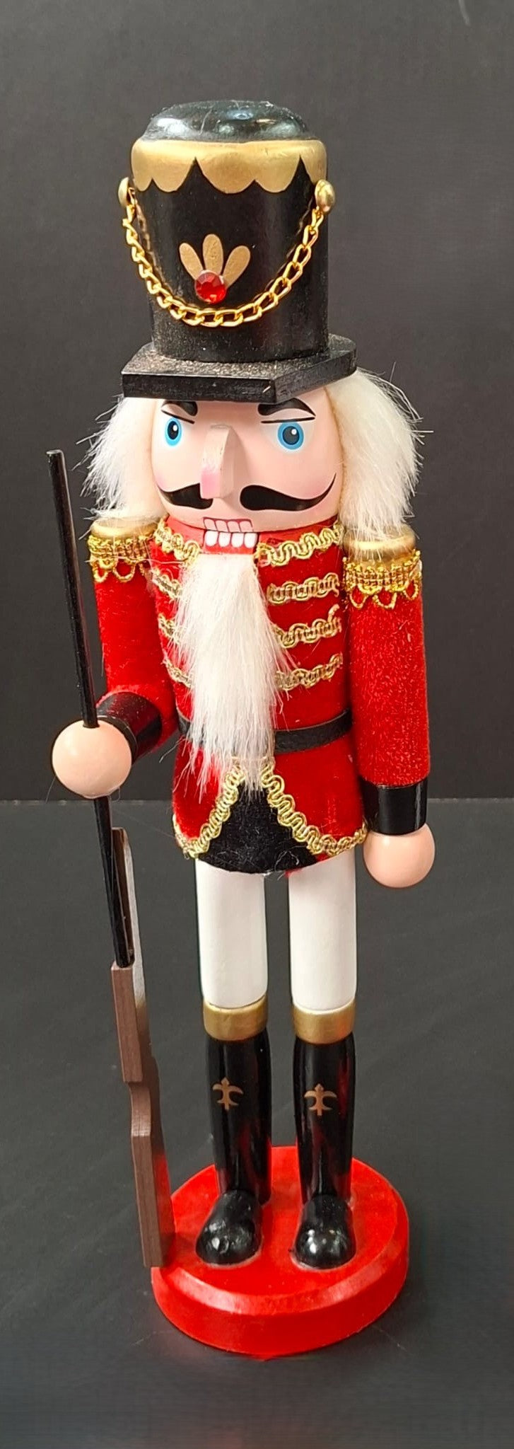 Figurină Spărgător de nuci din lemn, pictată manual în culori tradiționale de Crăciun – roșu, negru și auriu.